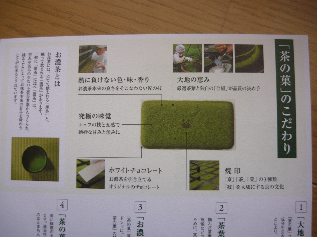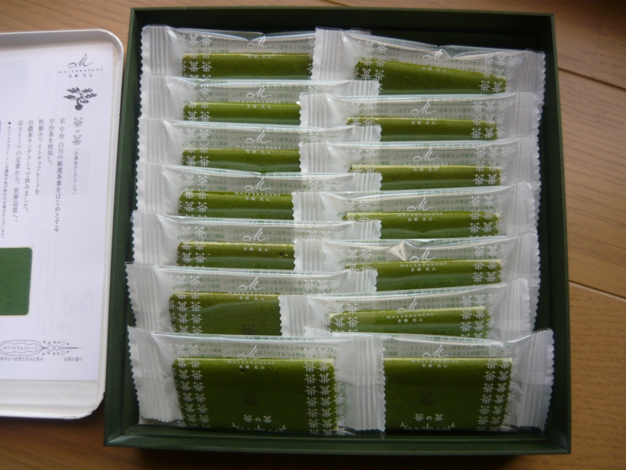 京都北山に本店があるマールブランシュさん。店舗が市内に数店、百貨店にも出店がある人気の洋菓子屋さんです。“茶の菓”というお菓子を購入(14枚入り2100円税込み)しました。ホワイトチョコレートを抹茶ベースのラングドシャでサンドしたもので、抹茶の香りも高くサクサクで美味しかった。ホワイトチョコが少し甘めなので、ブラックコーヒーのお供として良かったです。高級感があるのでちょっとしたお使い物にもおすすめです。