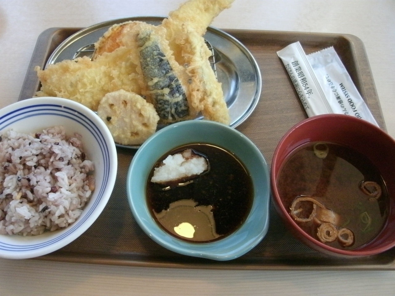 お昼時は混みそうなので14時ごろに入店しました。店内は広々としており、清潔感があり天井も高く開放感もあります。カウンター席とテーブル席がありスタッフさんから『お好きな席にどうぞ』と声を掛けられ、窓際の明るいテーブル席に座り“穴子の一本揚げ定食1,040円(税別)”をオーダー、ご飯は白ご飯か十穀米が選べたので十穀米をチョイス。3分ほどすると、食べ放題だという明太子とガリ牛蒡が入った容器が提供されました。待つこと10分足らず“穴子の一本揚げ定食”が到着、天ぷらのタネは穴子一本、烏賊、白身魚、南京、茄子で、これに赤だし(麩入り)、ご飯、天つゆが付いていました。