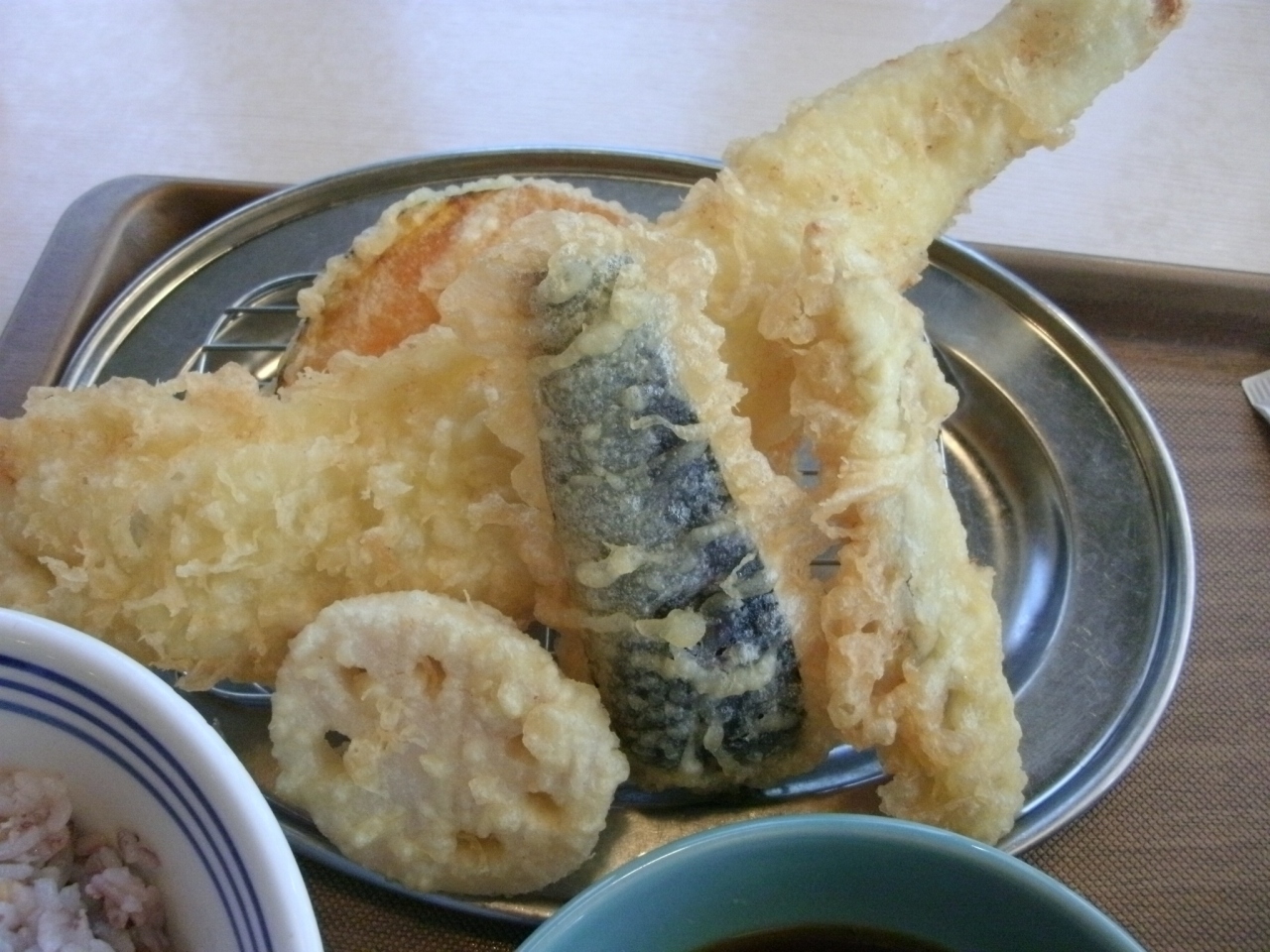 天婦羅は揚げたてアツアツ、サクサクで特に南京が甘くて美味しかった。天つゆとテーブルの上にあった塩の両方でいただいたが、塩を入れる小皿が無く、直接天婦羅に振りかけるしかなかったのは残念だった。