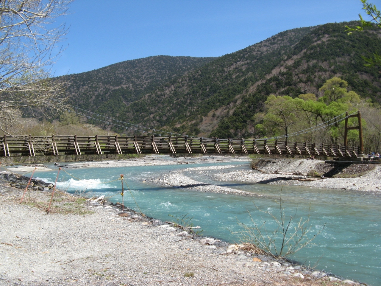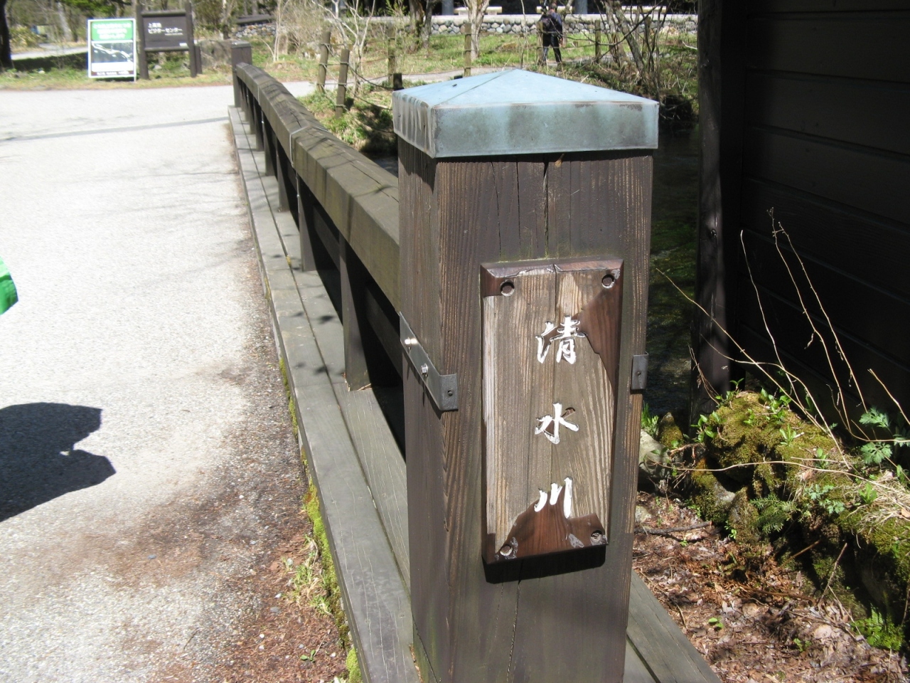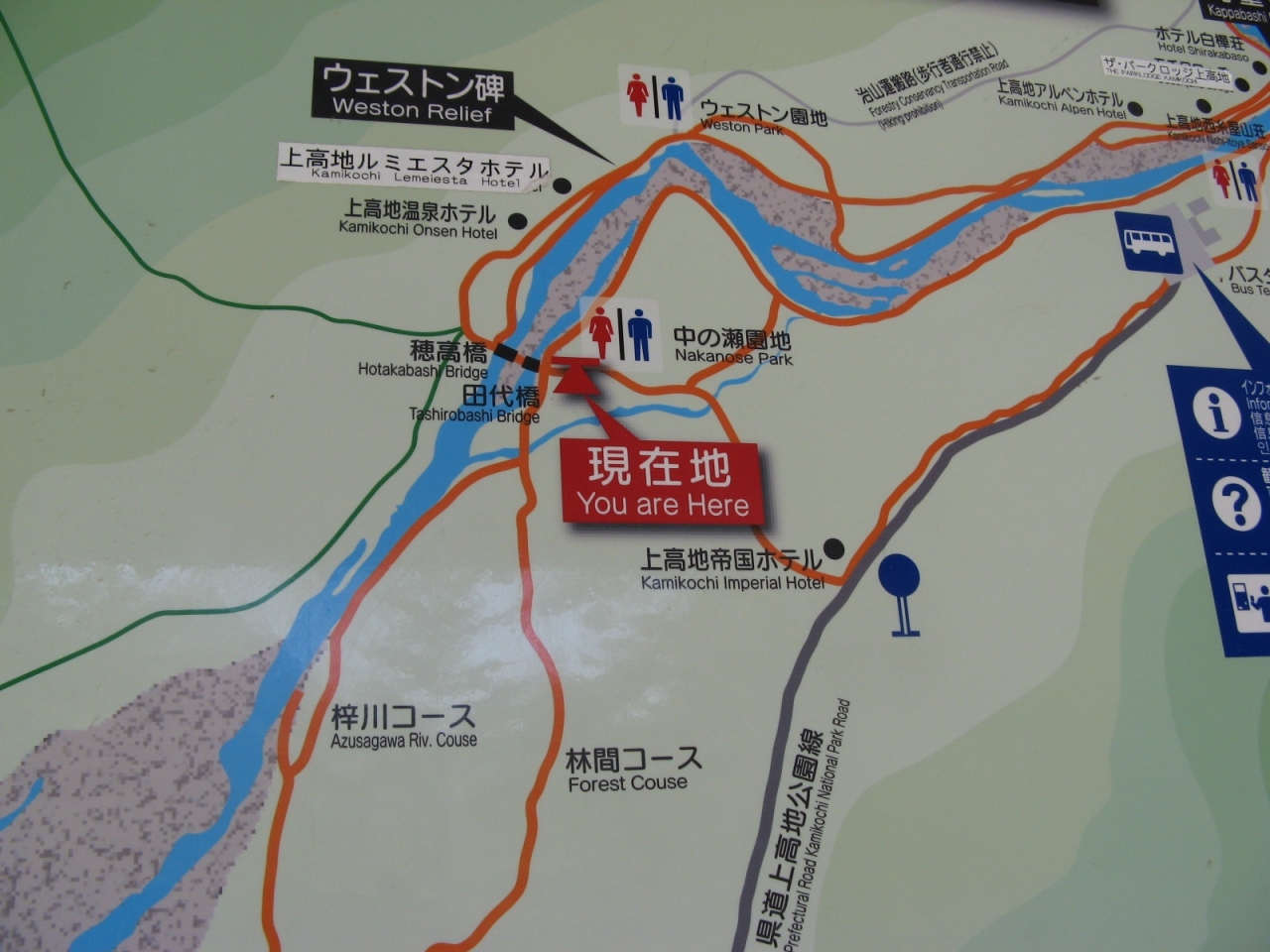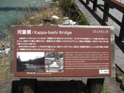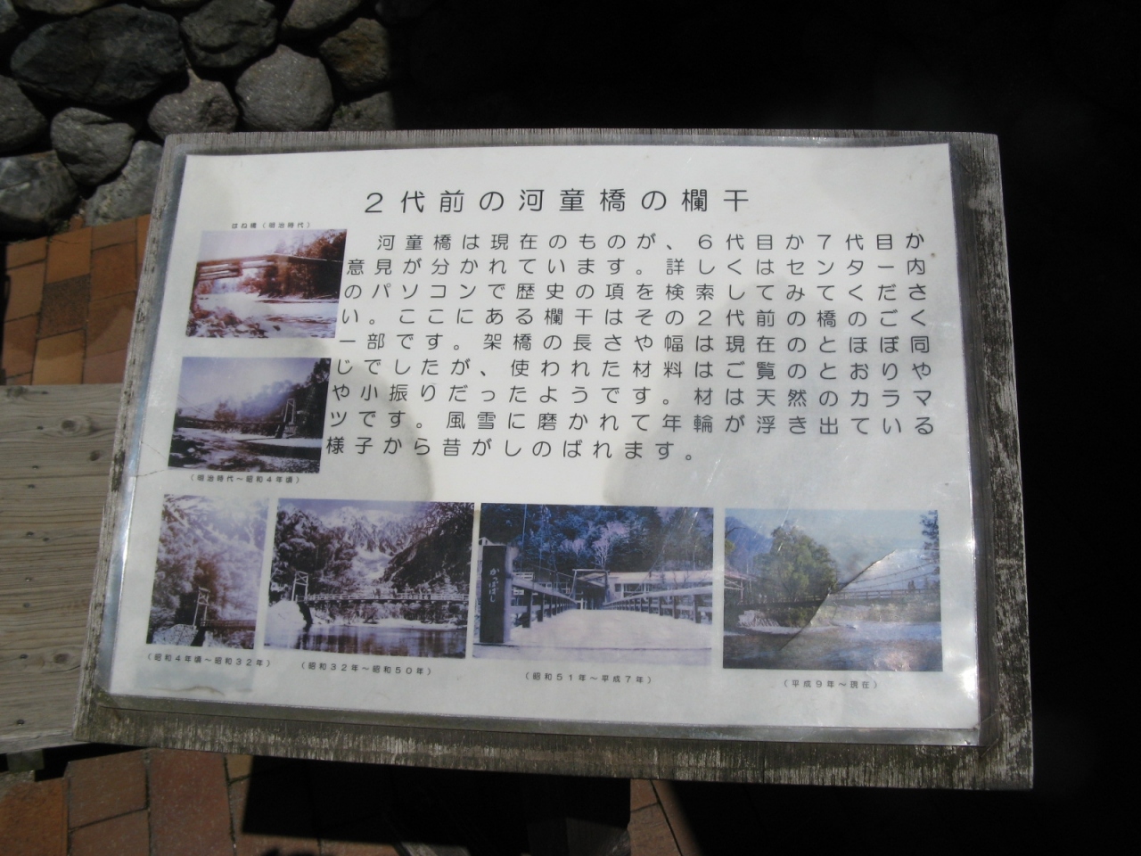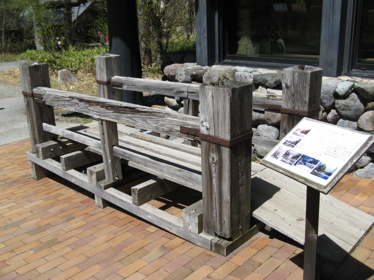 河童橋の左岸側から歩いて2~3分、上高地ビジターセンターの入口の横に展示されています。展示してあるものは欄干の一部で長さ2m、幅1mほどの大きさです。現地にある説明板の写真(添付写真を参照ください)を観ると明治から現在まで6代の河童橋があったようで、初代の河童橋が“はねね橋”であったことに驚きました。