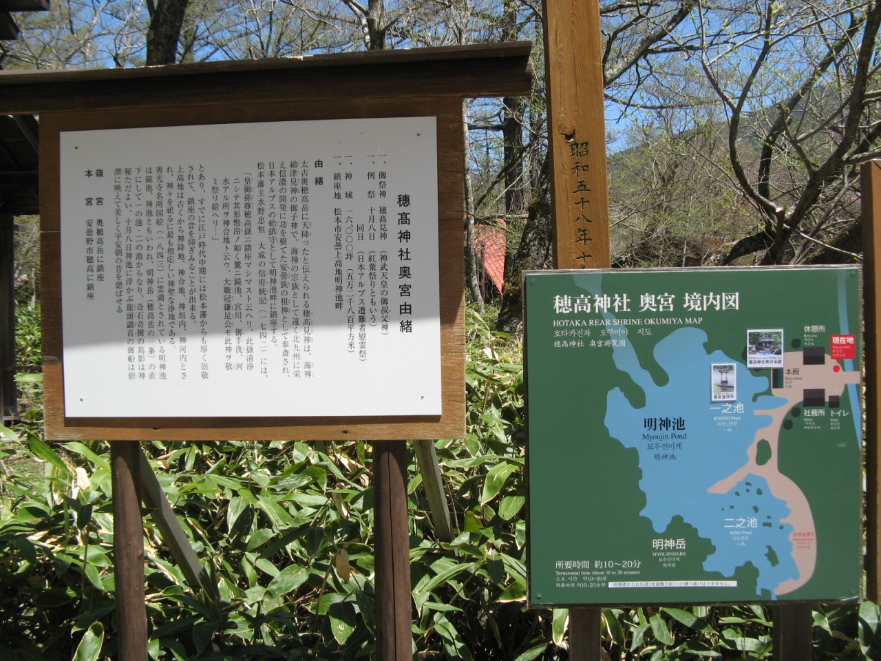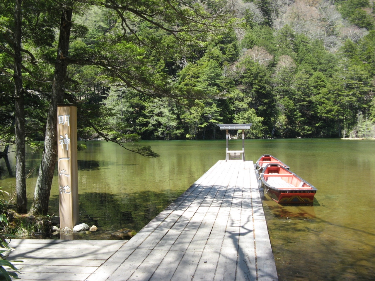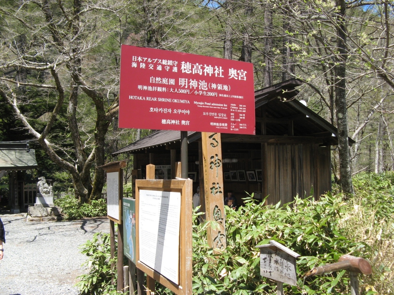 穂高神社奥宮境内の裏手にあります。社務所で拝観料500円を払ってから池の敷地に入ります。「一之池」には小さな鳥居と拝殿があり、その奥に庭園の様な「二之池」があります。池の背後には明神岳が聳え、凛とした神聖なエネルギーに包まれたパワースポットという感じで拝観料500円の価値は十分あると思いました。