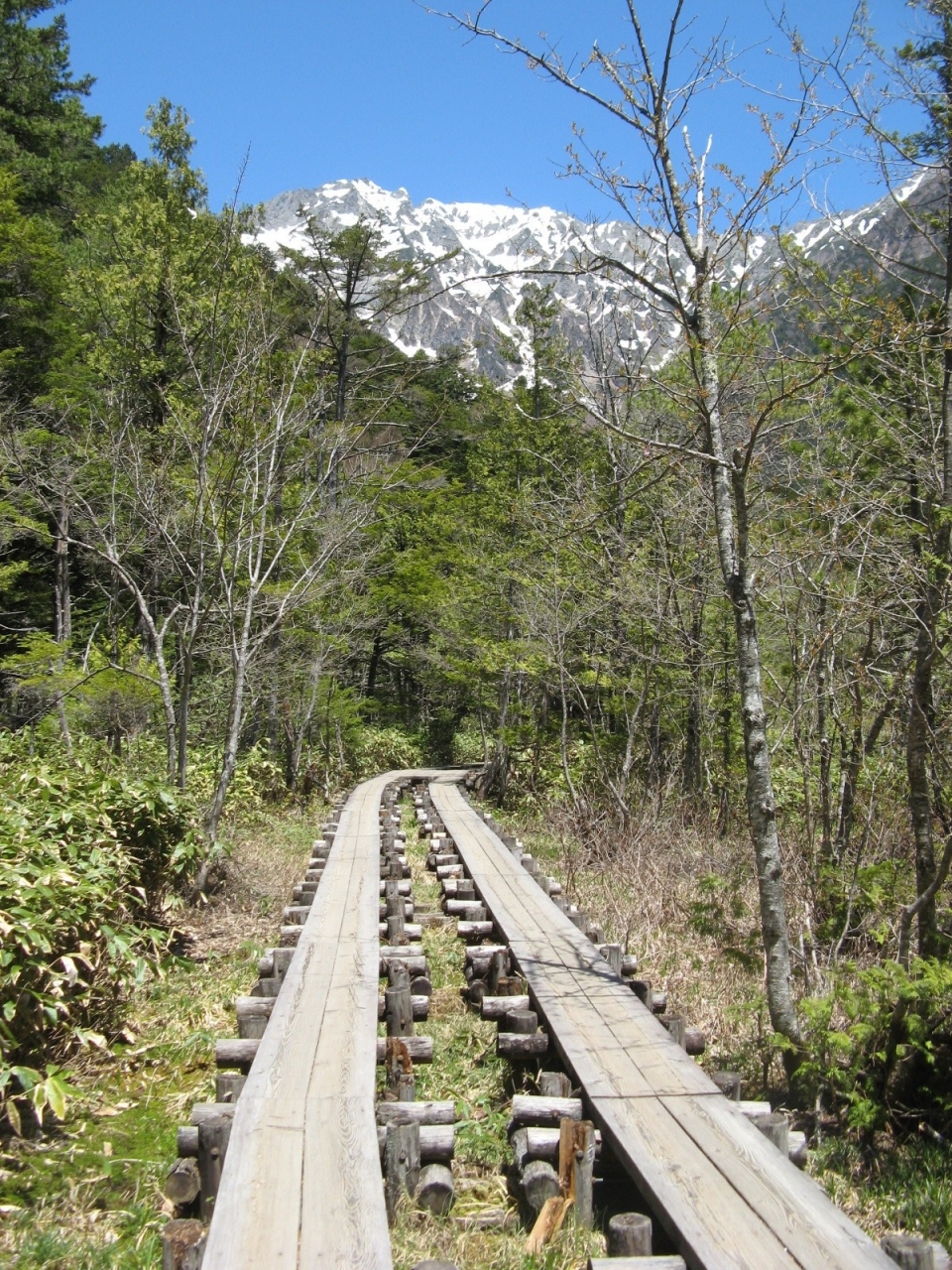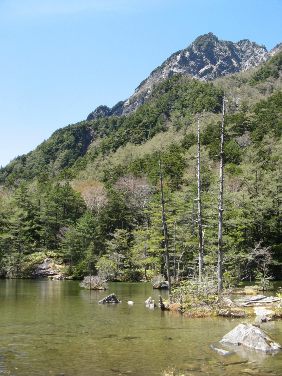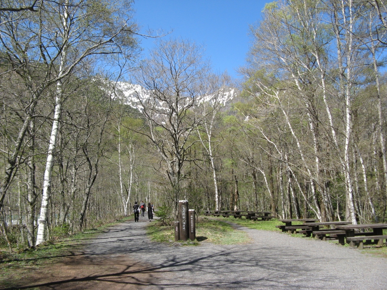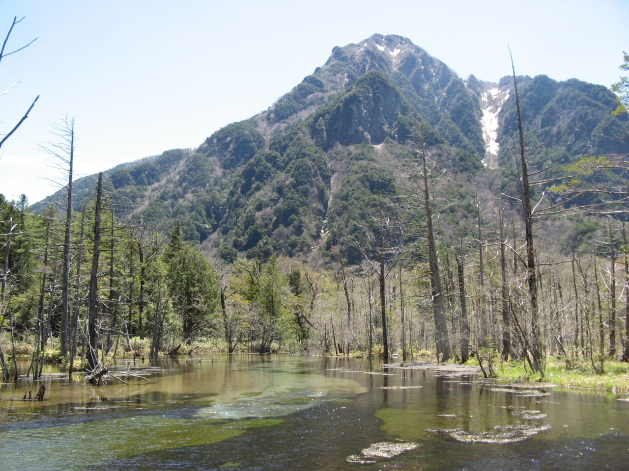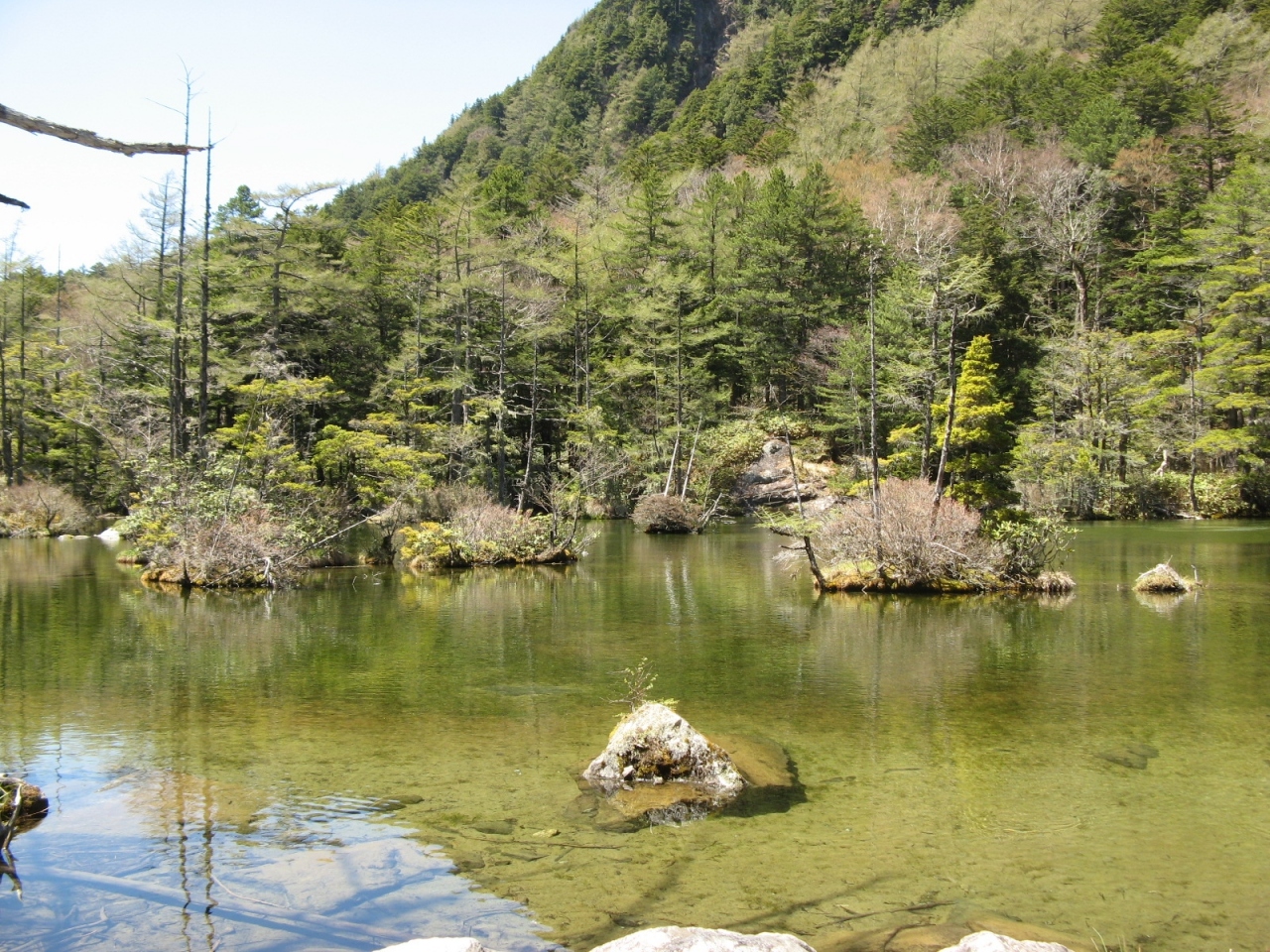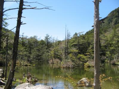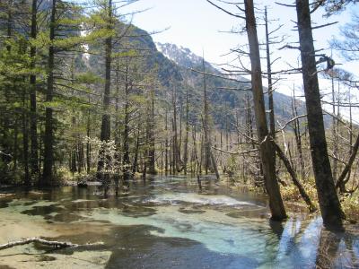 河童橋から明神池までは梓川の右岸側と左岸側のルートがあるので行きと帰りを別々のルートにした方が色んな景色を楽しむことができます。右岸側の見所の一つは「岳沢湿原」で、透き通った浅い水辺に立ち枯れの木々が目立つ美しい景色を観ることができます。途中の道も比較的平坦で木道などで整備されている部分もあって歩き易いです。左岸側は整備された林道で道幅も広くて楽で、見所の一つに「清流」の清流があります。河童橋からなら行きは梓川の右岸側、帰りは左岸側のルートがオススメです。