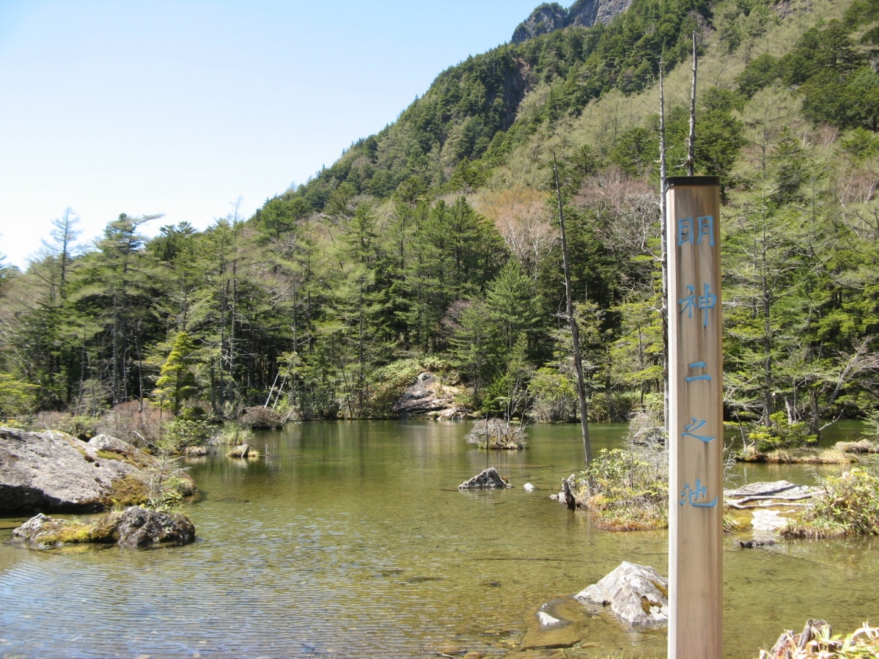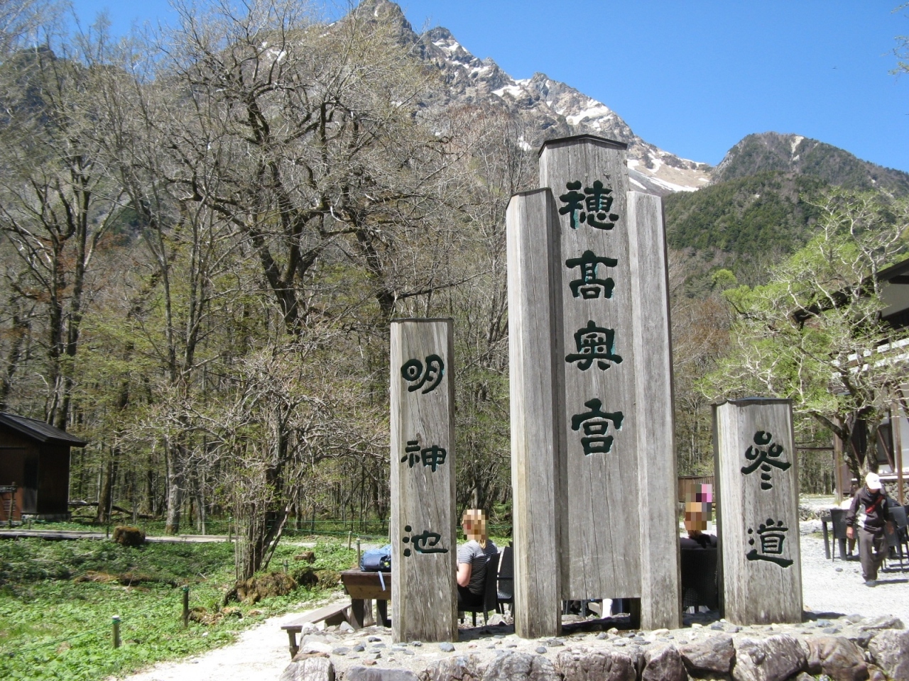 河童橋から歩いて1時間足らずのところに鎮座されています。安曇野市にある穂高神社の奥宮で日本アルプスの総鎮守、海陸交通守護の神様として崇められ、境内の奥には明神池があります。明神池を拝観するには社務所で拝観料500円を払う必要がありますが、池の背後にそびえる神山「明神岳」が見渡せ神聖な雰囲気は拝観料の価値は十分ありました。