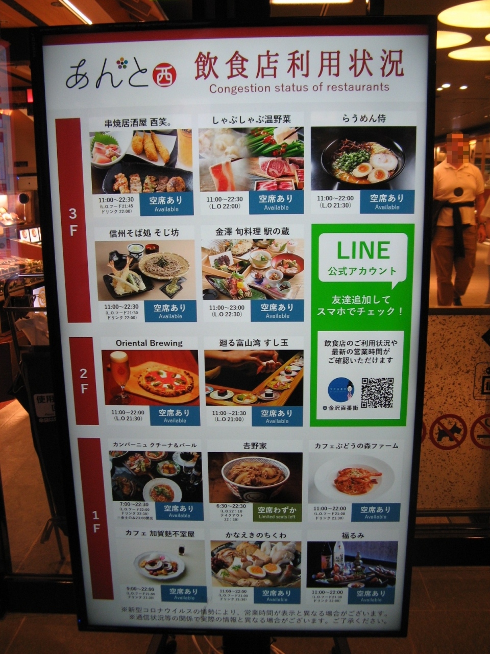 JR金沢駅にあるショッピングモールです。銘菓や伝統工芸品、加工食品など金沢を代表する老舗や名店がたくさん入っています。館内のあじわい小路には、中華料理や麺類、カレー、郷土料理などが楽しめる飲食街もあり、飲食街の入り口には「飲食店利用状況」を示す装置があり便利だなと思いました。駅に直結しているので金沢観光の帰りに食事したりお土産やお弁当を買うのにとても便利なところです。