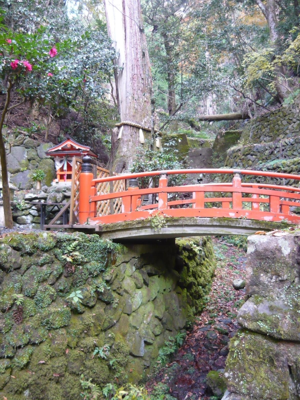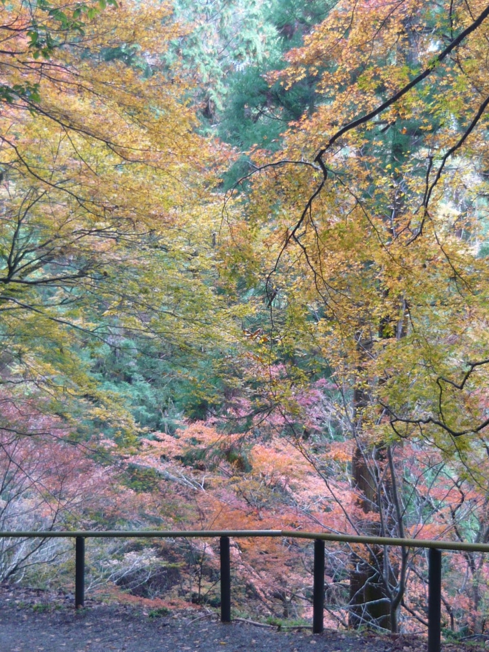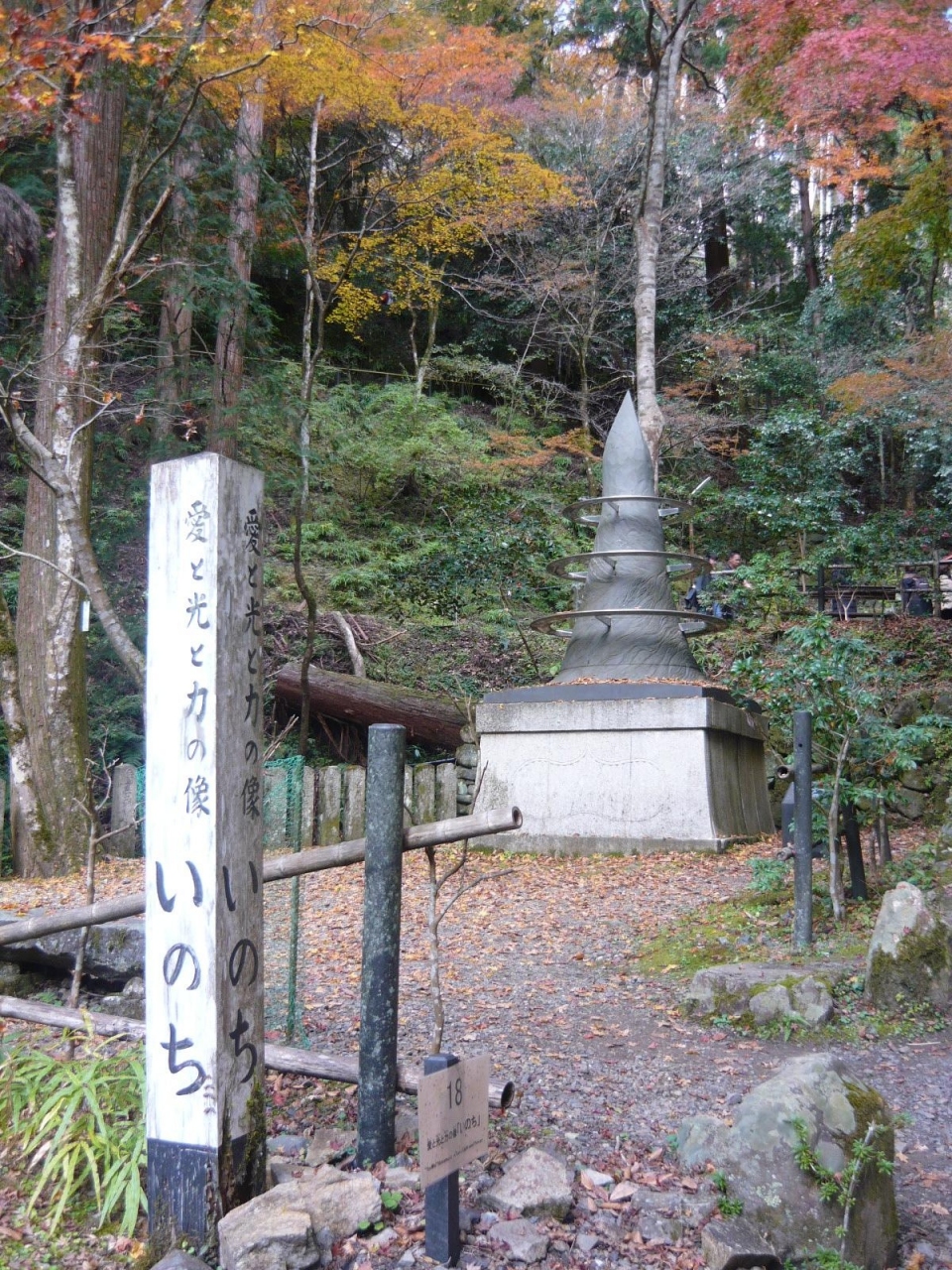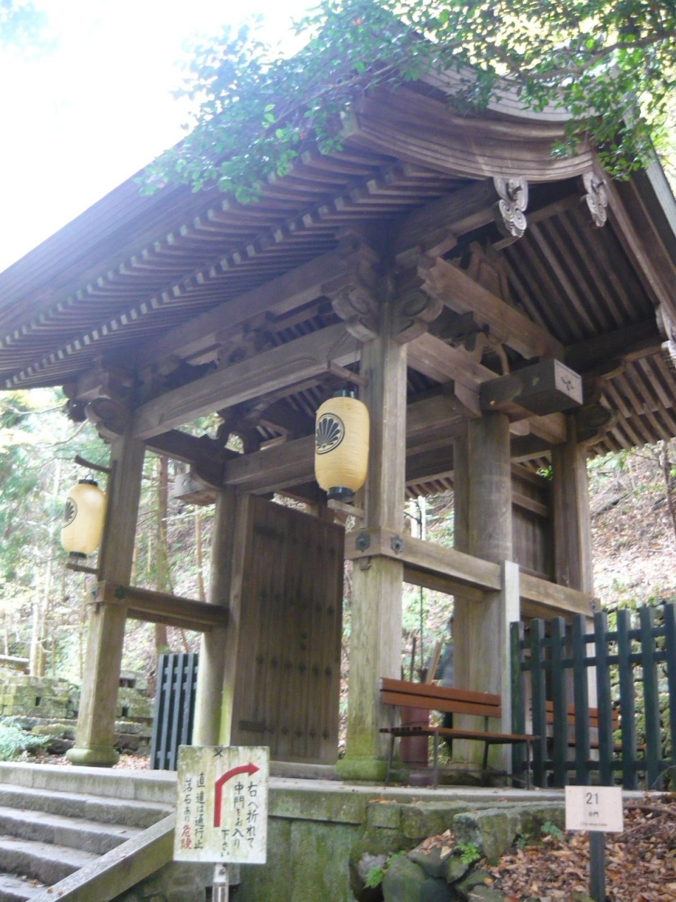 鞍馬寺の参道となっている九十九折参道。距離約1km、歩いて上ると30分ぐらいかかると聞いていたので、山門を越えてすぐのところにあるケーブルカー(200円)に乘って多宝塔まで行き、そこから歩いて本堂金堂にお参りし、帰りに九十九折参道を下りました。途中には、鞍馬寺の中門や大黒天・恵比寿尊を祀る双福苑、鞍馬山の本尊である尊天(大宇宙生命・エネルギー)を具象化した愛と光と力の像「いのち」、石階段が拝殿を貫いている珍しい桃山建築の由岐神社、魔王の瀧などの史跡があり、紅葉さかりの参道をブラブラ下るのはとても楽しかった。九十九折参道を上って本堂まで行くのは石段が多くちょっと大変なので、足に自信がない人はケーブルカーを利用して本堂まで行き、帰りに参道を下ることをおすすめします。