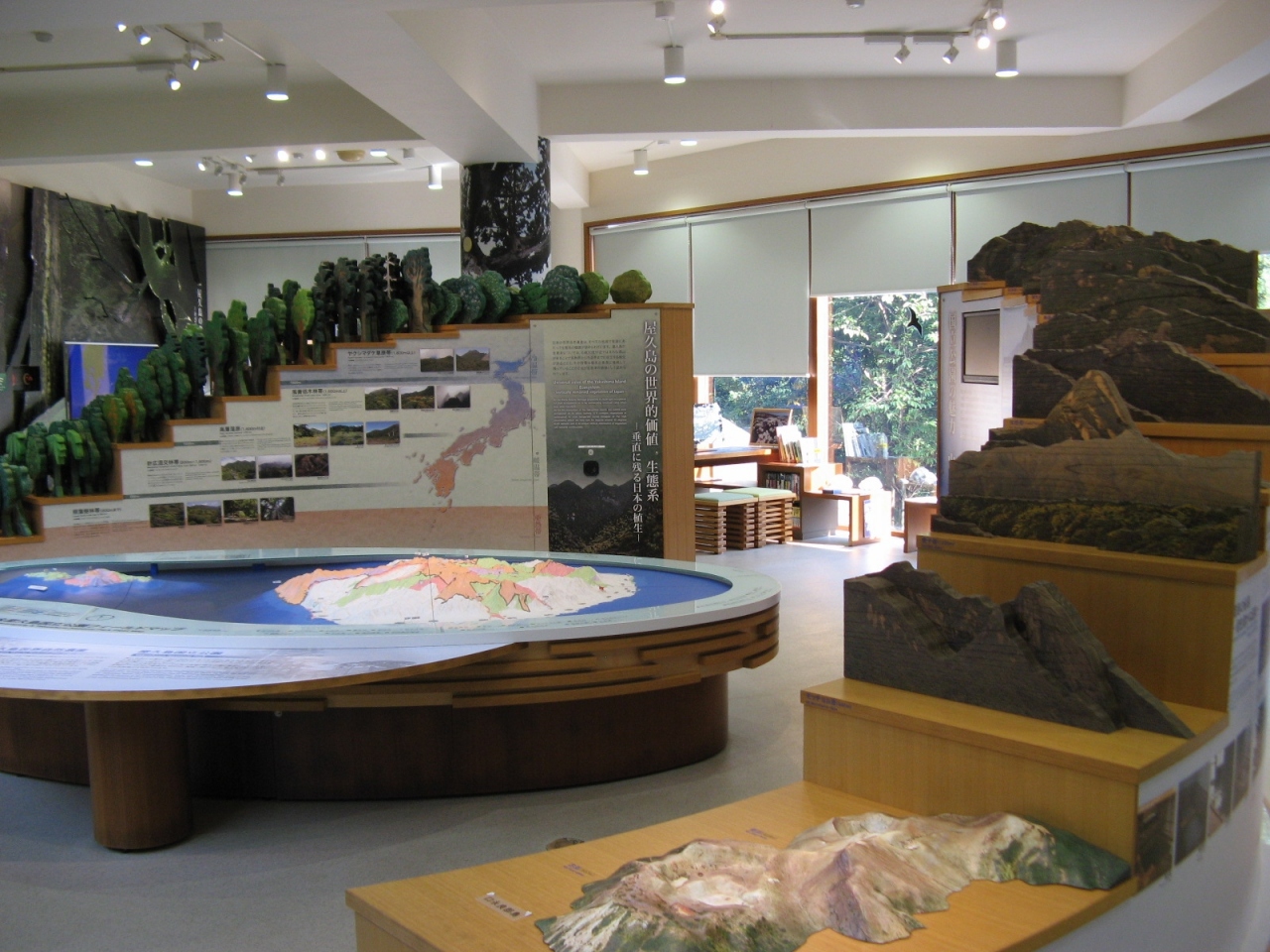 パネルや映像を使って屋久島の自然の成り立ちから環境保全の取り組み、登山の際のマナーやルールなどを展示・紹介しています。ライブラリーではタッチパネルで屋久島の季節ごとの写真を検索できたり、図書も閲覧できるようになっています。