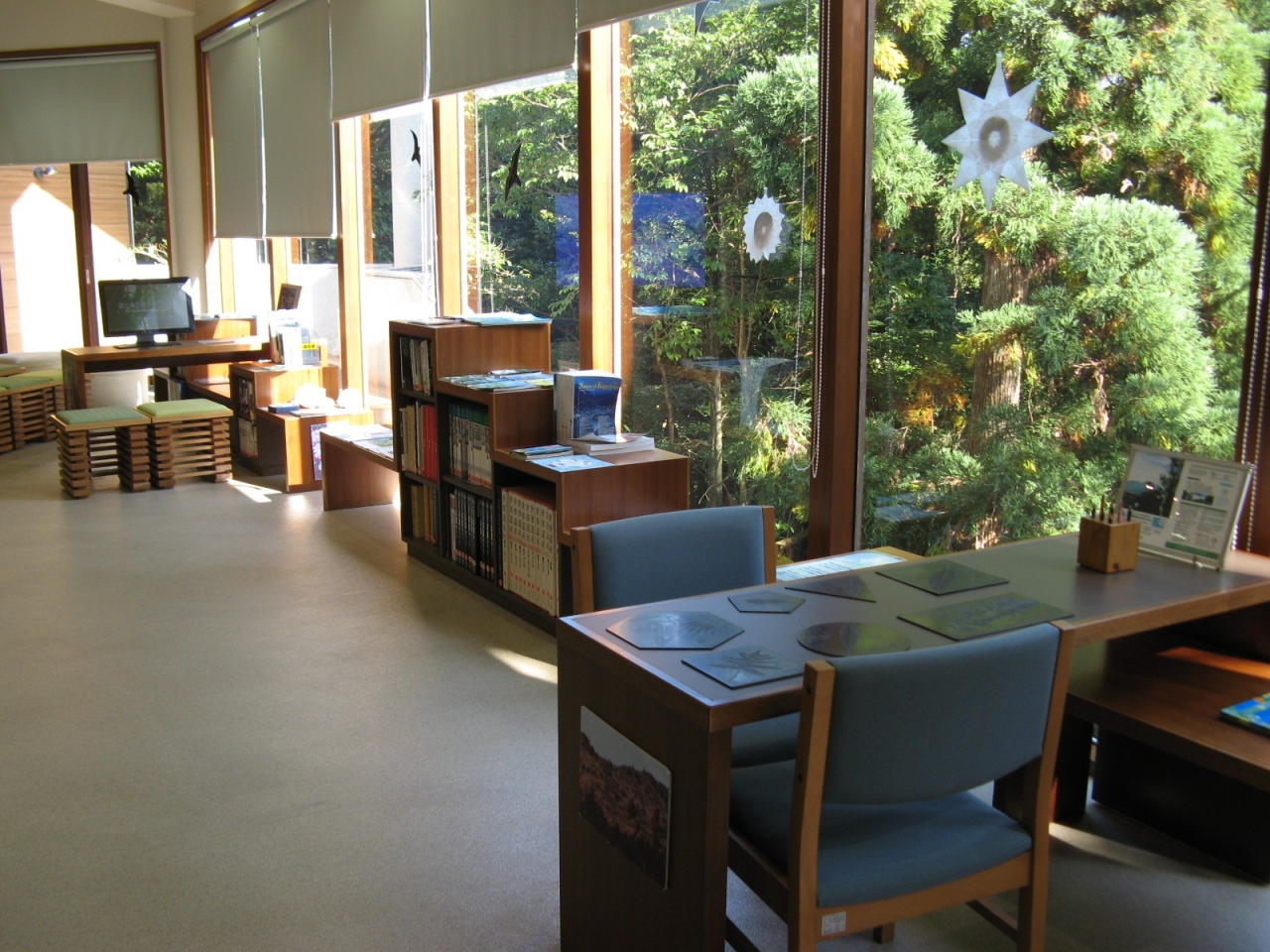 一階の売店では屋久杉の工芸品や飲物などが販売されています。二階は机や椅子が備え付けられた広い休憩スペースになっていて屋久杉の生態や分布、特徴などを記したパネルが展示されていました。