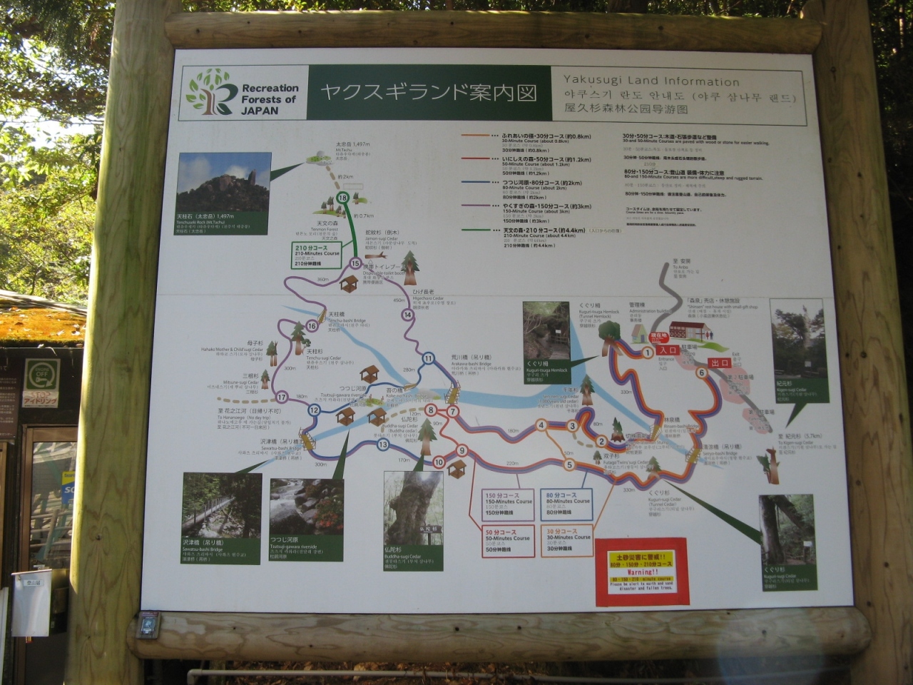 コースは木道や石張歩道、擬木階段などで整備されていて白谷雲水峡と比べてかなり歩きやすく、主要ポイント毎に番号を記した経路表示板があるので迷うことなく散策することができました。清らかな川や緑豊かな苔、樹齢1800年の仏陀杉や千年杉、くぐり杉などの大木などを観ながら屋久島の自然を堪能することができました。