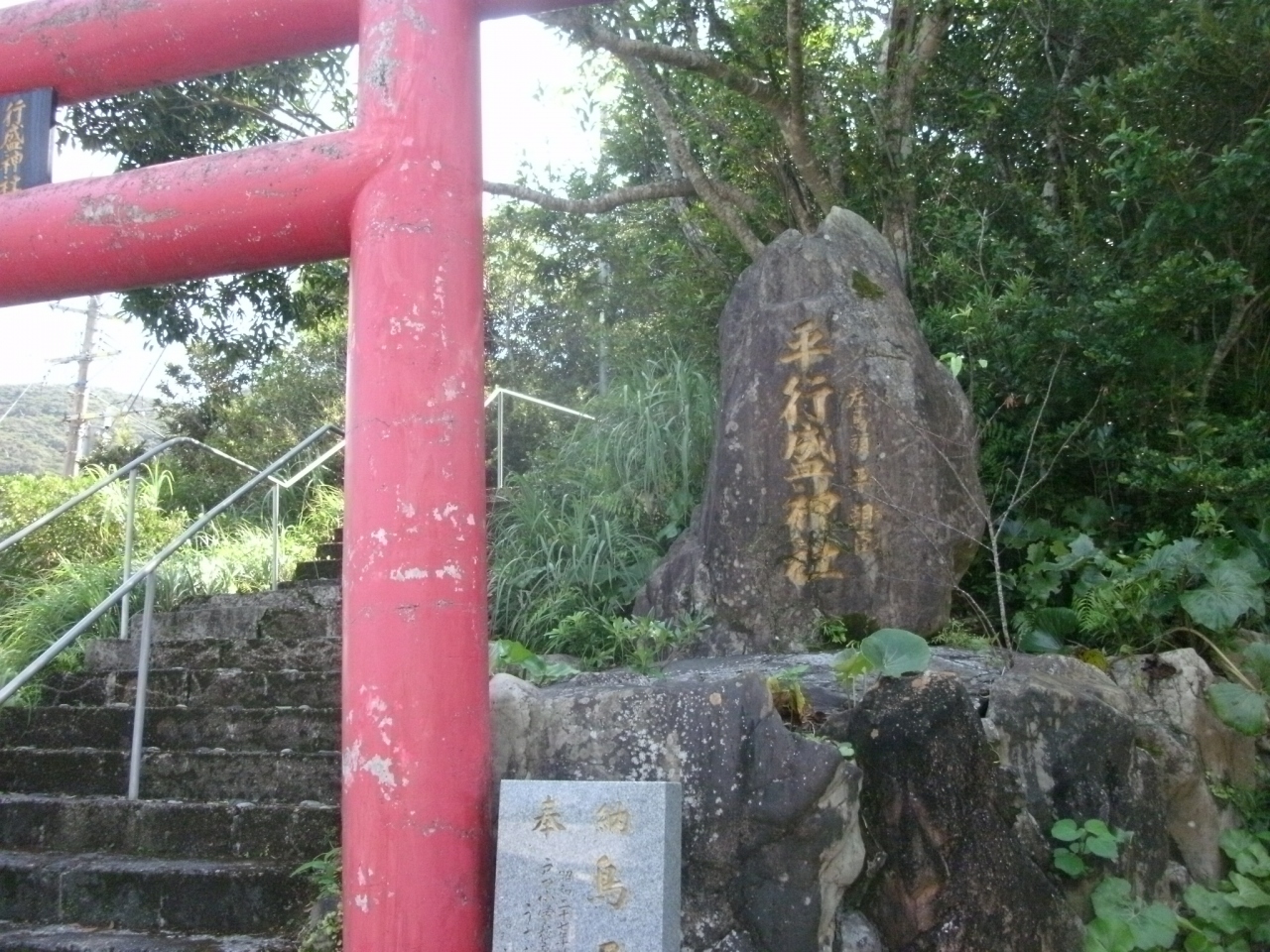 平家の落人である平行盛を祀った神社で、現地にある説明板(写真参照)には、『1185年、壇ノ浦の戦いで破れた平家の一族は南島に落ち延びたと言われている。そのうち、資盛、有盛、行盛は大島を攻め征服した。そして、資盛は諸鈍に、有盛は浦上に、行盛は戸口に城を築きそれぞれ敵の襲来を警戒したと伝えられている。』とあります。