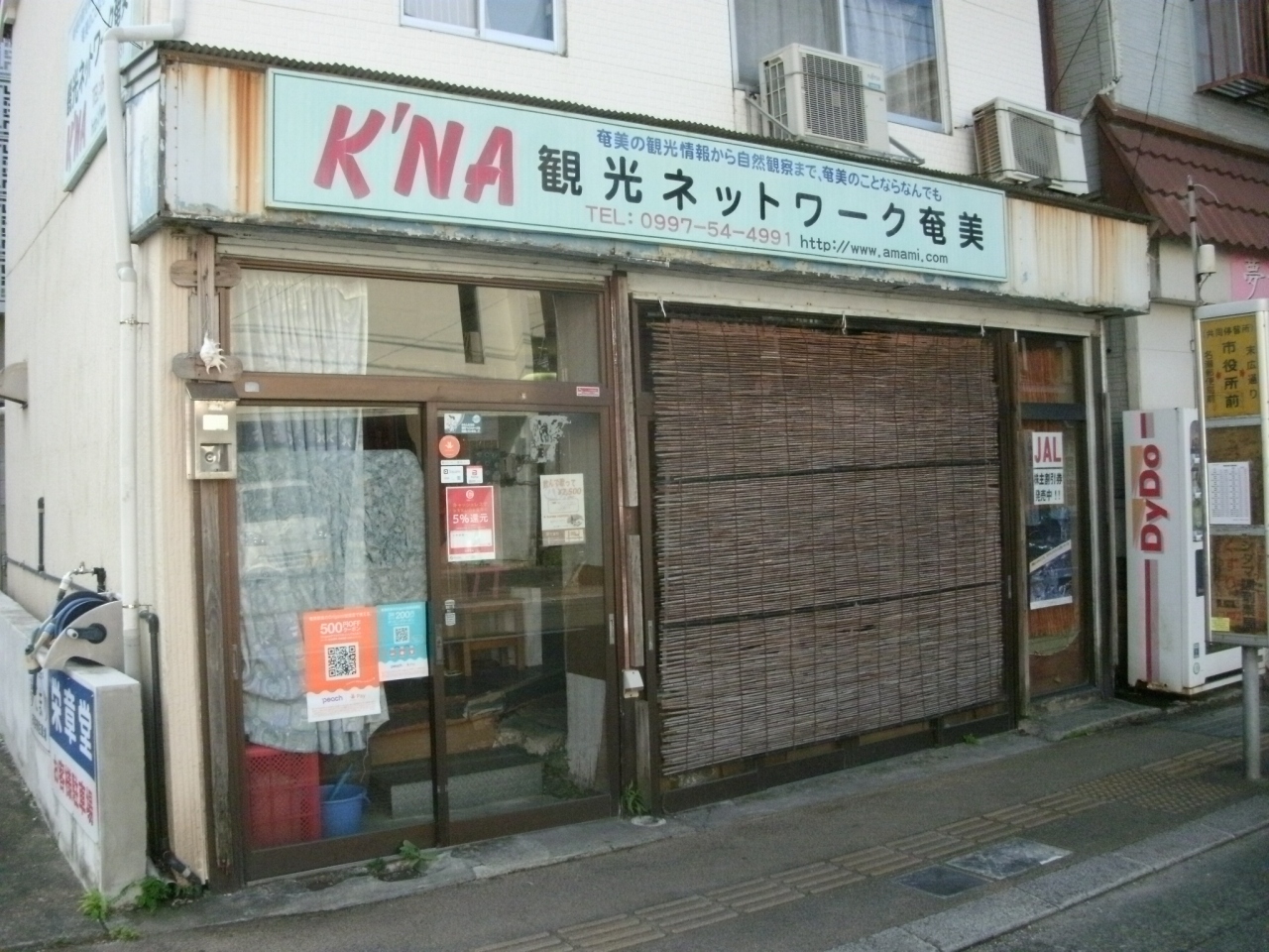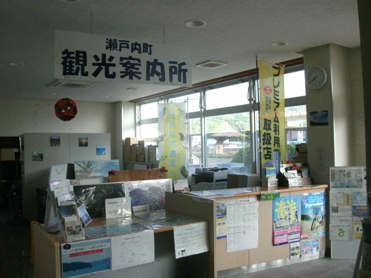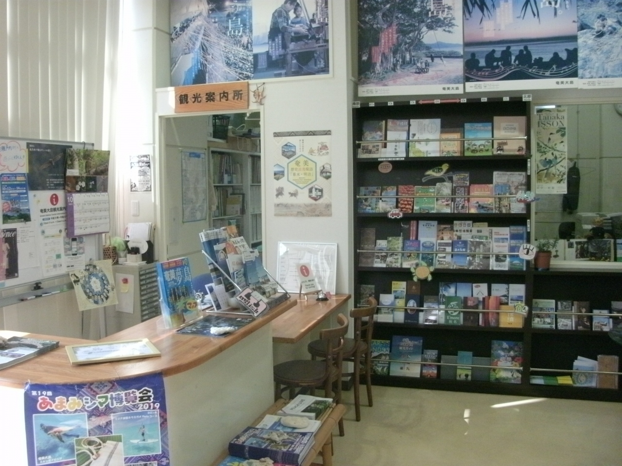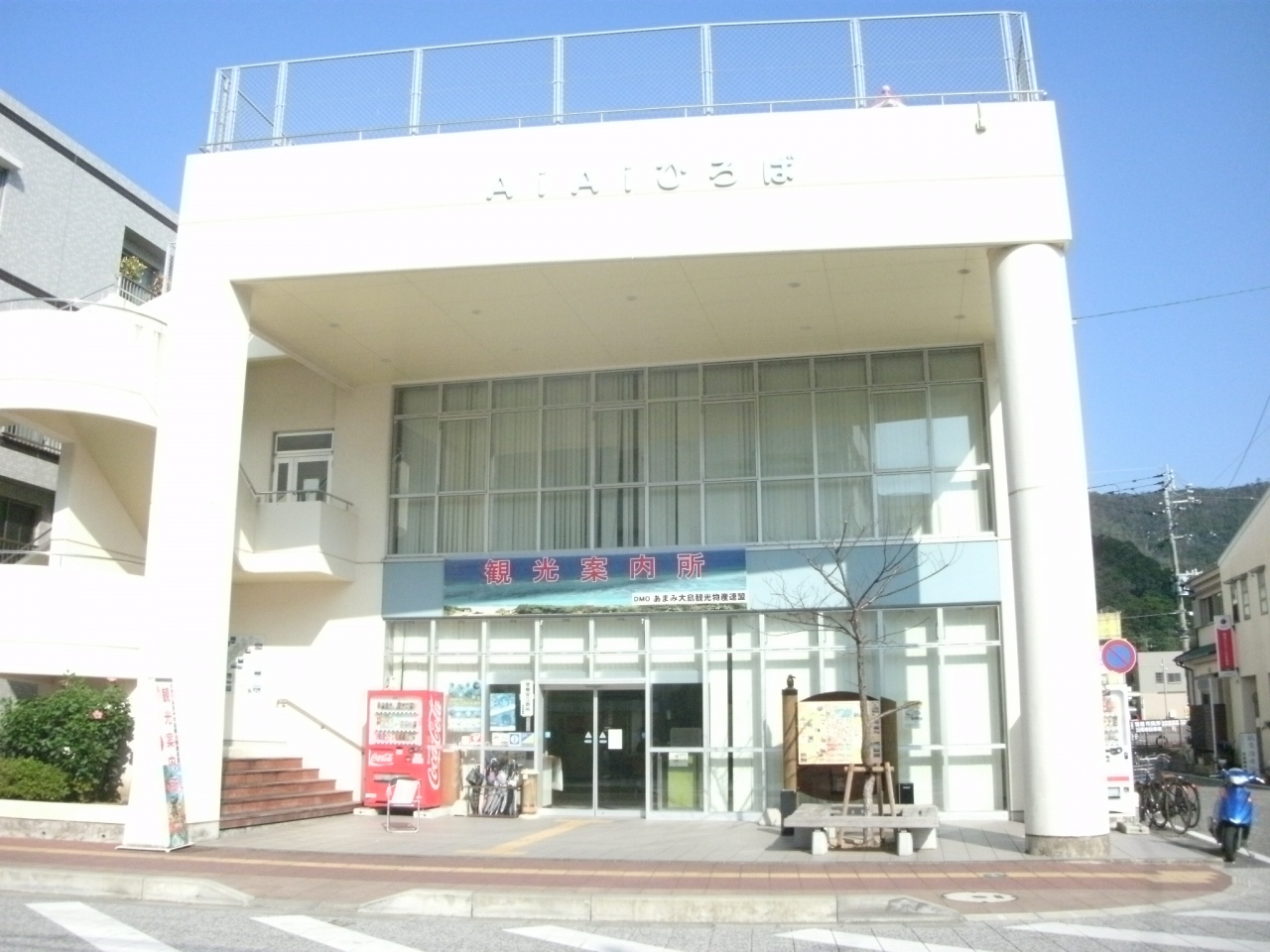 名瀬の中心街、永田橋通り(県道79号線)と末広本通りが交わる交差点を北に50mほど行った右手にあります。三階建ての建物は地域の交流センターになっていて、一階にある観光案内所には沢山の観光パンフレットが用意されていて、奄美の特産品である黒糖焼酎の展示コーナーもありました。また、一階にある休憩スペースは広くて、机と椅子も用意されていて自由に利用できるパソコンもあるので、休憩したり旅程を検討したりするのに便利なところでした。市内散策で疲れた時に休息したり、観光に関する情報を収集するのにいいところです。