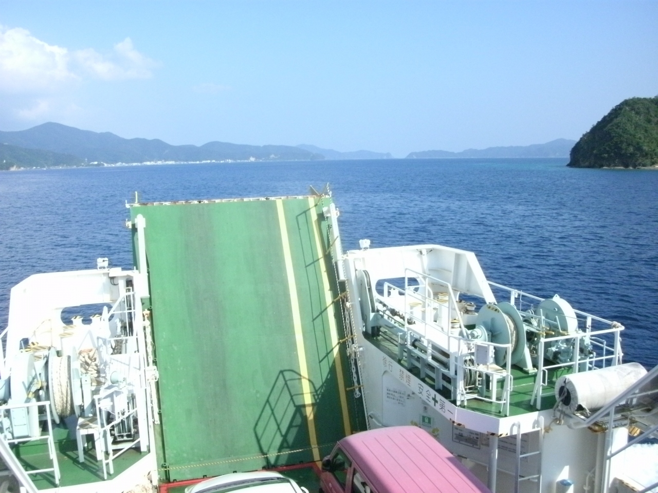 奄美本島側の古仁屋港と加計呂麻島の瀬相港と生間港を交互に往復してます。所要時間は瀬相港間が25分、生間港間が20分で、生間港間の方が5分短いですが運賃はどちらも同じで、往復運賃で買うと5%ほど安くなります。ただし、往復運賃は2日間の適用なので長く加計呂麻島に滞在する場合は注意が必要です。2016年に就航した「かけろま」は一階部分が車庫、二階部分が客室で客室の椅子はゆったりしていて居心地がよかった。往路は生間港着、復路は瀬相港発を利用しましたが大島海峡の景色をのんびり眺めているとあっという間に到着。僅か20分ほどの乗船でしたが天気も良く、気持ちの良い船旅でした。