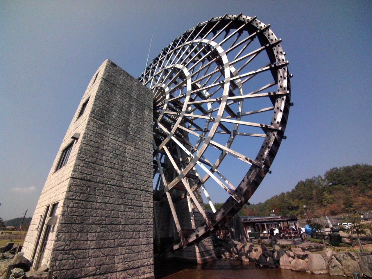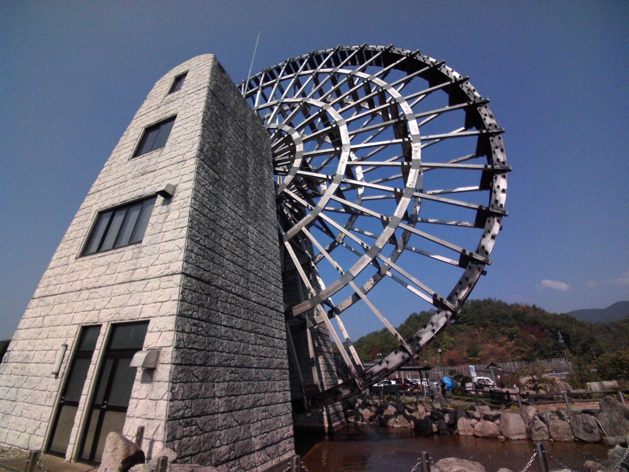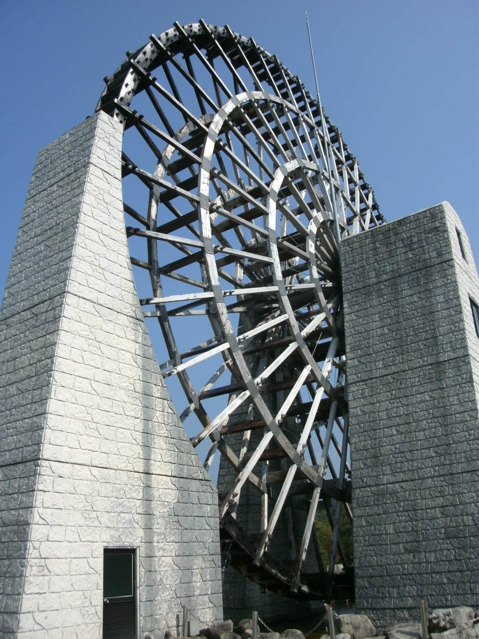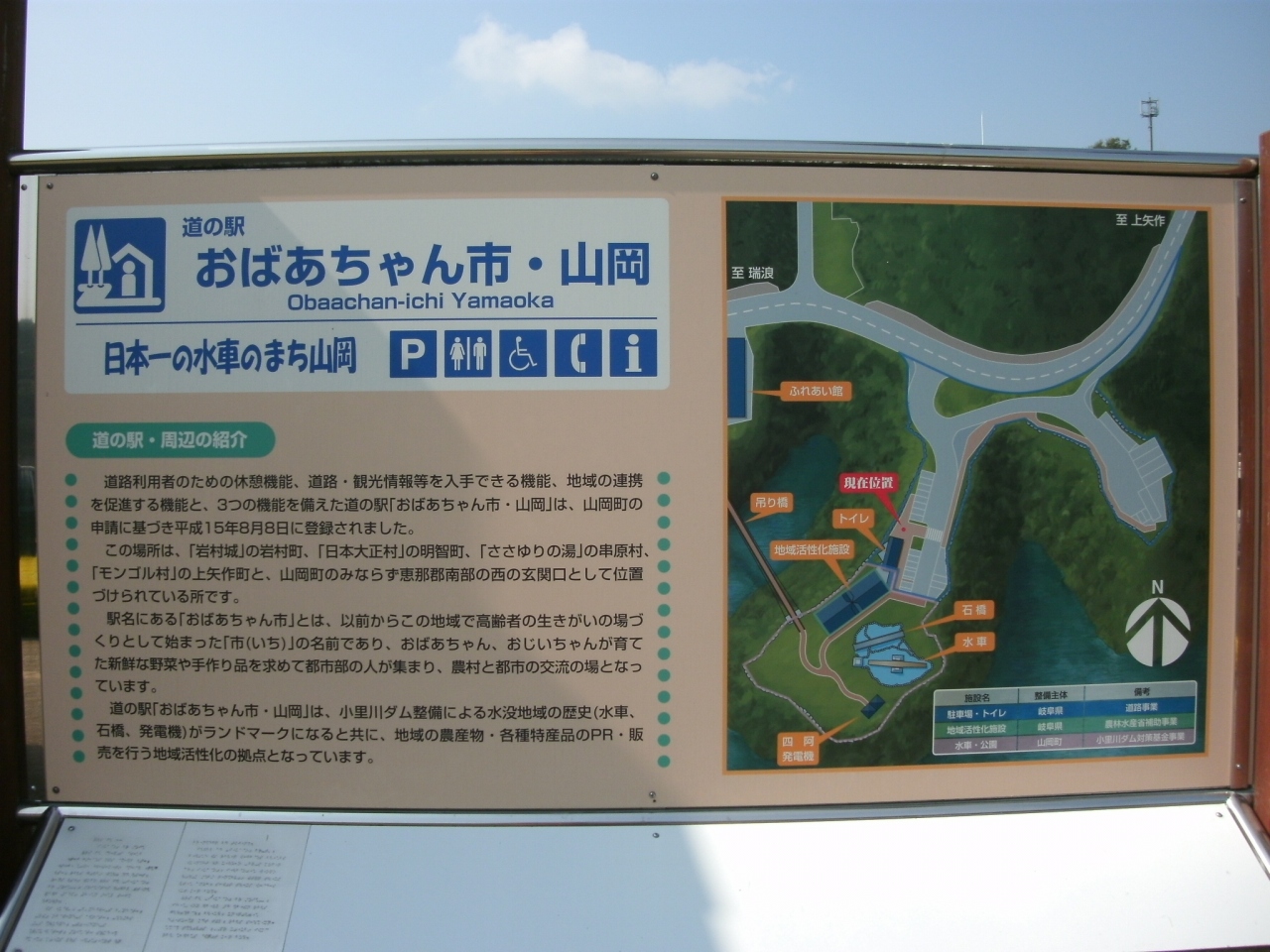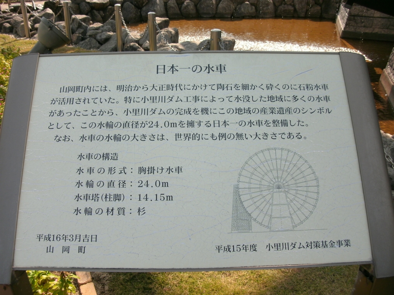 道の駅おばあちゃん市・山岡のシンボルとなっている「日本一の木製水車」。遠くから観ると観覧車の様で、近くで見ると驚くほど大きくびっくりしました。傍にある説明板(添付写真参照)によると、明治・大正時代にかけてこの地には陶石を砕くための石粉水車が活用されていたが、小里川ダムの工事によって水没したものが多くあったので、この地域の産業遺産のシンボルとして整備したものとありました。直径24mもある水車に近づいて超広角のレンズで撮影すると誇張されて扇風機のような写真が撮れました。