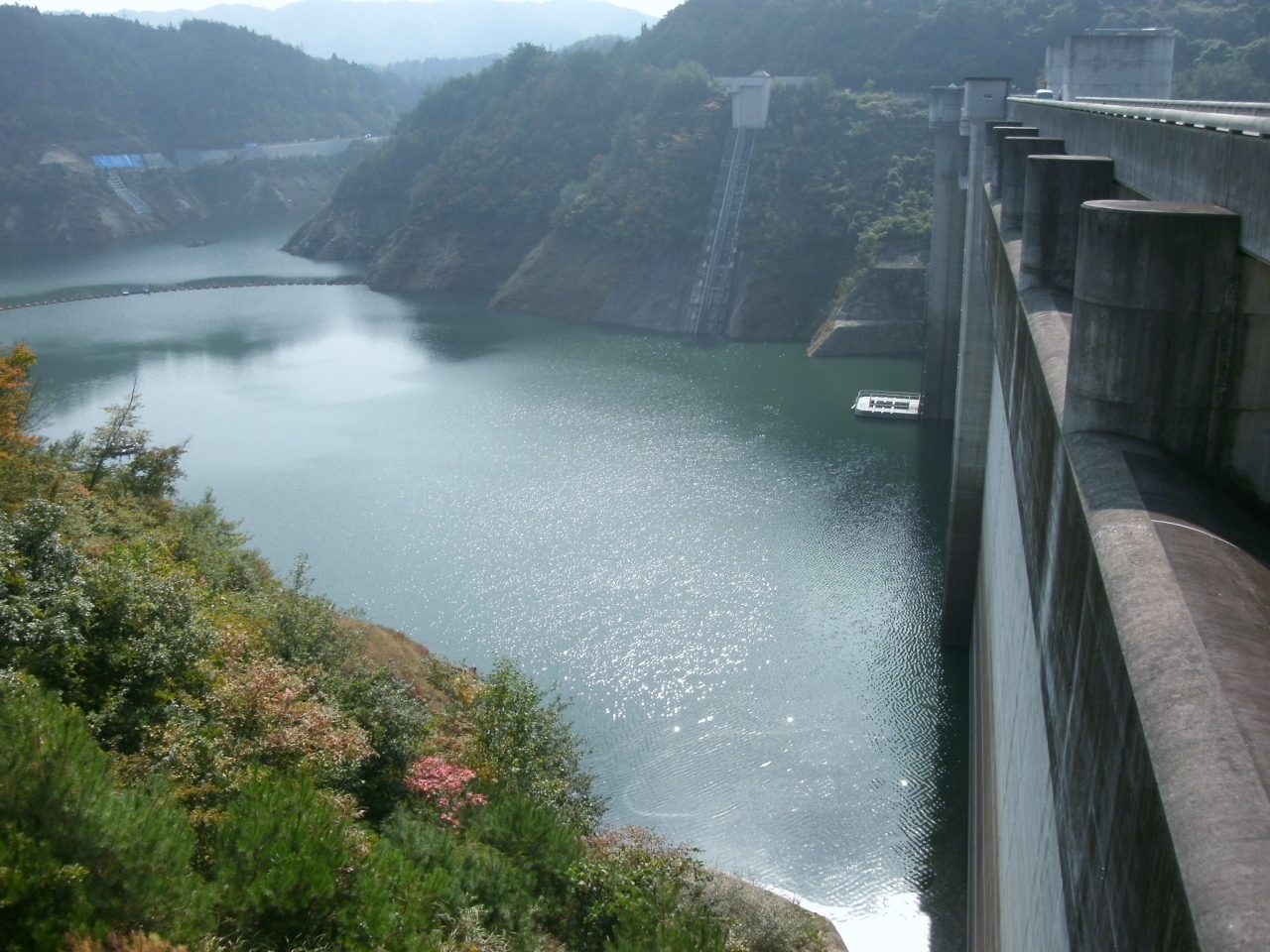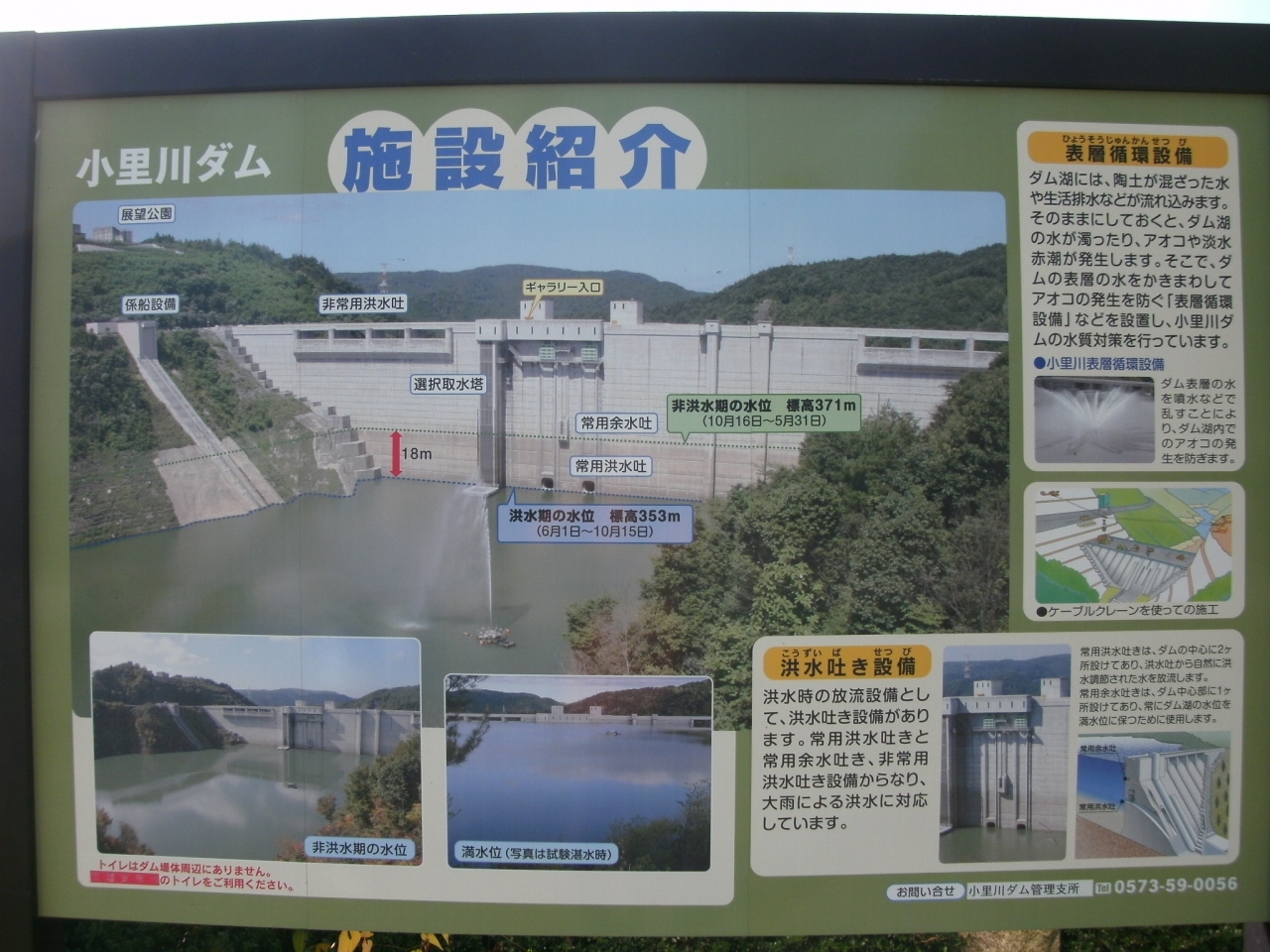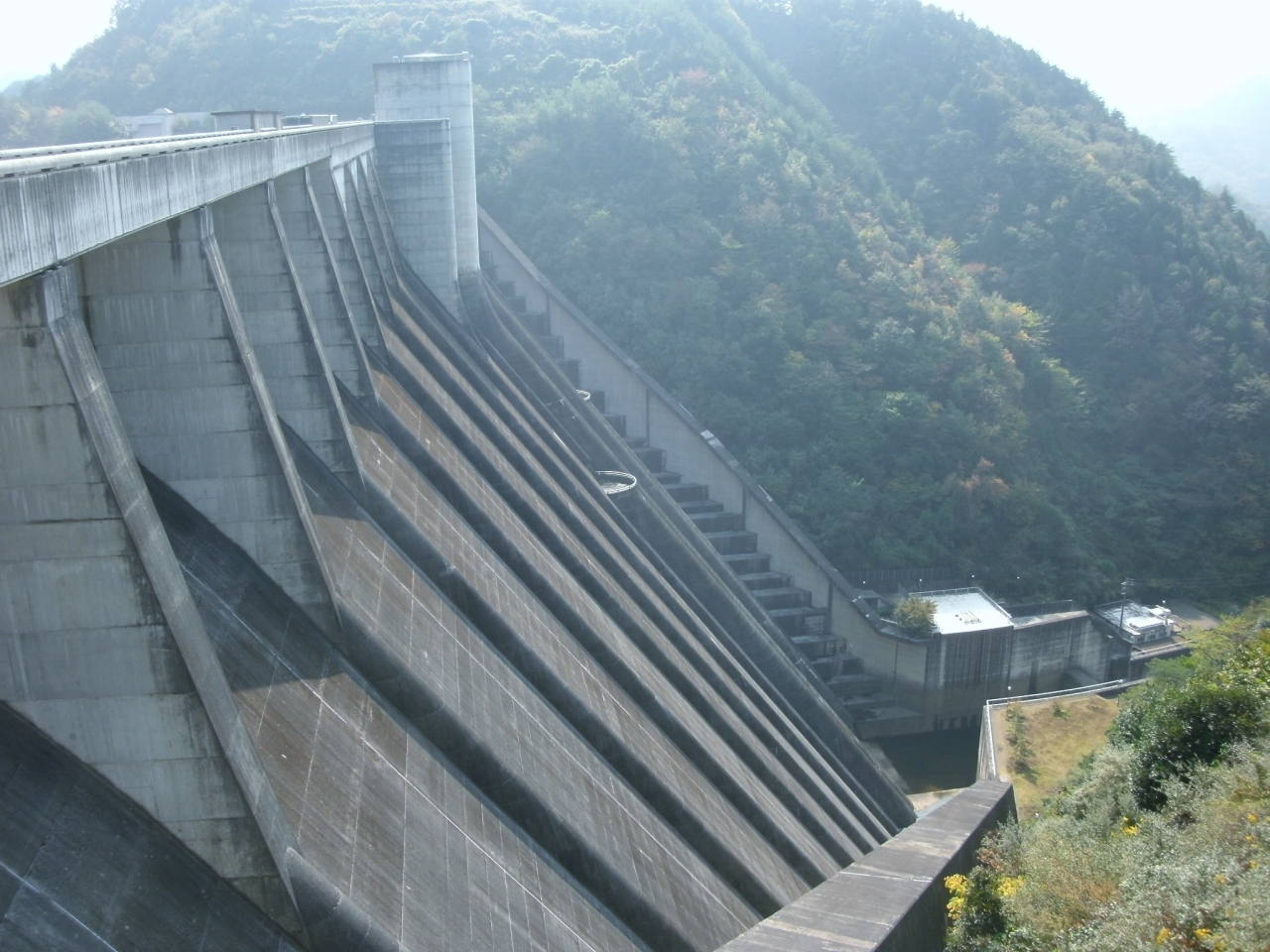 「小里川ダム」は洪水調節、流水の正常な機能の維持、発電を目的とした、堤高114m、堤頂長331.3mの重力式コンクリート式ダムです。ダム堤体の下流面は、常用洪水吐導流壁を半円形断面とし、非常用洪水吐部にも半円形導流壁を配置しているところに特徴があります。