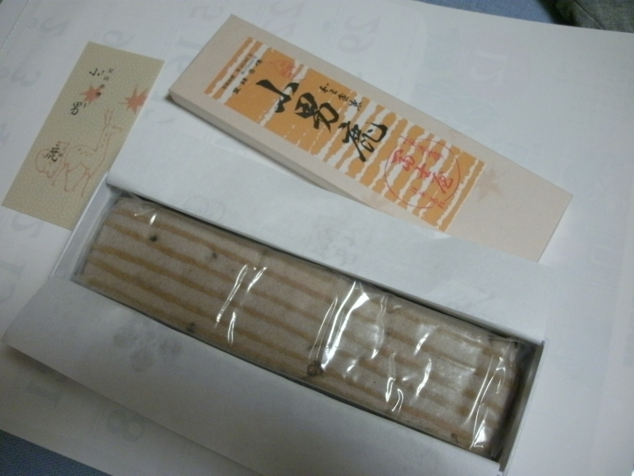 お店はJR徳島駅のすぐ前にあります。徳島の代表的な銘菓“小男鹿(さおしか)”という棹物菓子で有名な和菓子のお店です。“小男鹿”は見た目はカステラのようですが、少しもっちりしていて、カステラと九州特産の和菓子である“かるかん”の中間のような感じのものです。口の中で山芋と小豆の香りがほのかに広がり、しっとりとした舌触りで、和三盆糖を使っているので上品な甘さは後を引きます。一本2060円と少々お値段は張りますが、しっかりした化粧箱に入っているので、見栄えも良いのでちょっとしたお使い物に良いです。