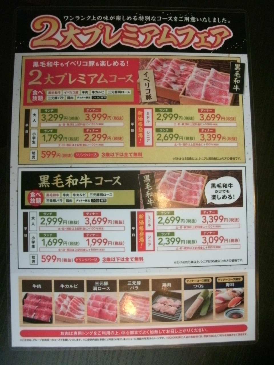 焼肉が食べ放題のお店です。コースは58品食べ放題と、キングコース、ブレミアムコースの3種類あります。お肉やサラダ、一品、デザートなどが100分で食べ放題のキングコース2980円を頂きました。オーダーするときは、テーブルに置かれたタブレットで注文できるので、いちいちスタッフさんを呼ぶ必要が無く、便利です。値段が値段だけにお肉の質はそれなりですが、柔らかいし3種類あるタレの味も良かったです。ダイヤモンド上カルビが美味しかったので3回オーダーしました。