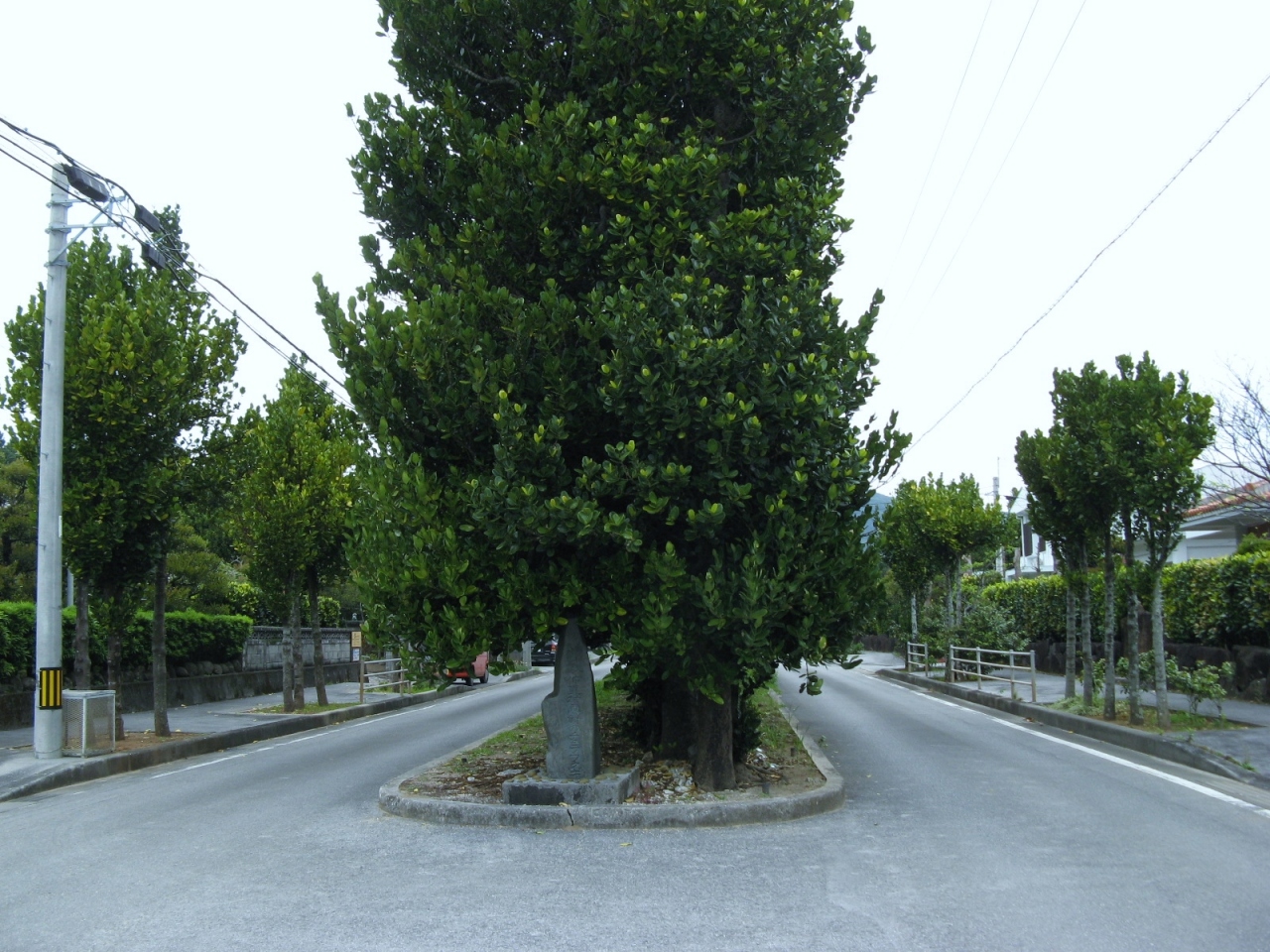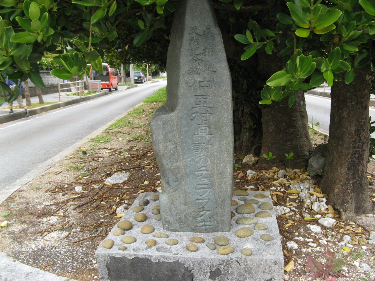 久米島の東側、真謝集落内を通る県道の中央に数十メートルに渡って続くフクギ並木です。現地の説明板には、『もともとは防風林として屋敷の周りに植えられていたものが、道路拡張により伐採されそうになったが、その一部が保存された』とありました。