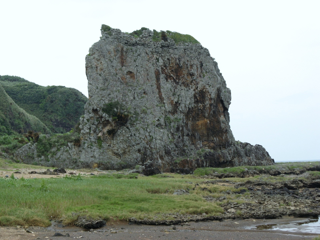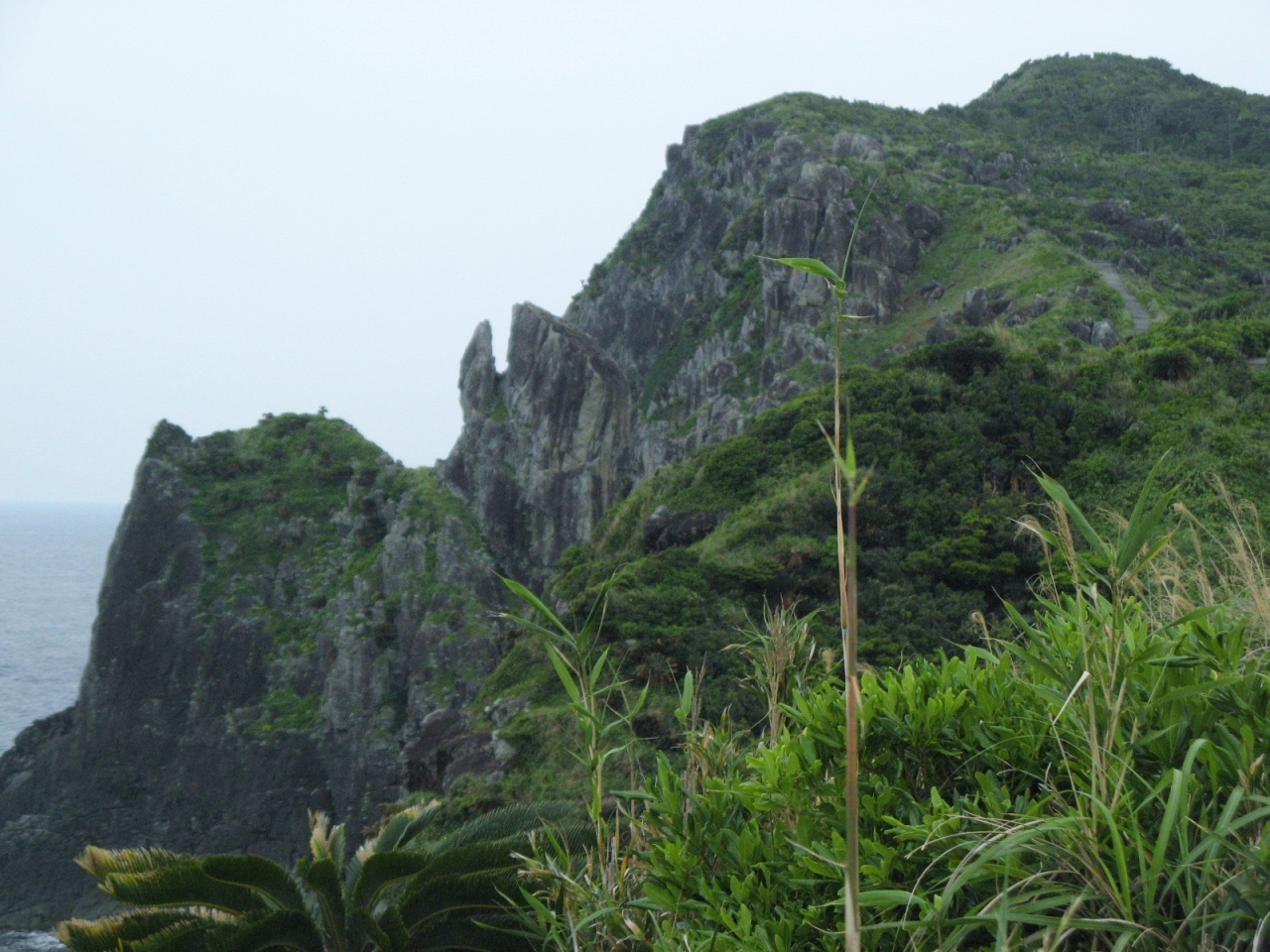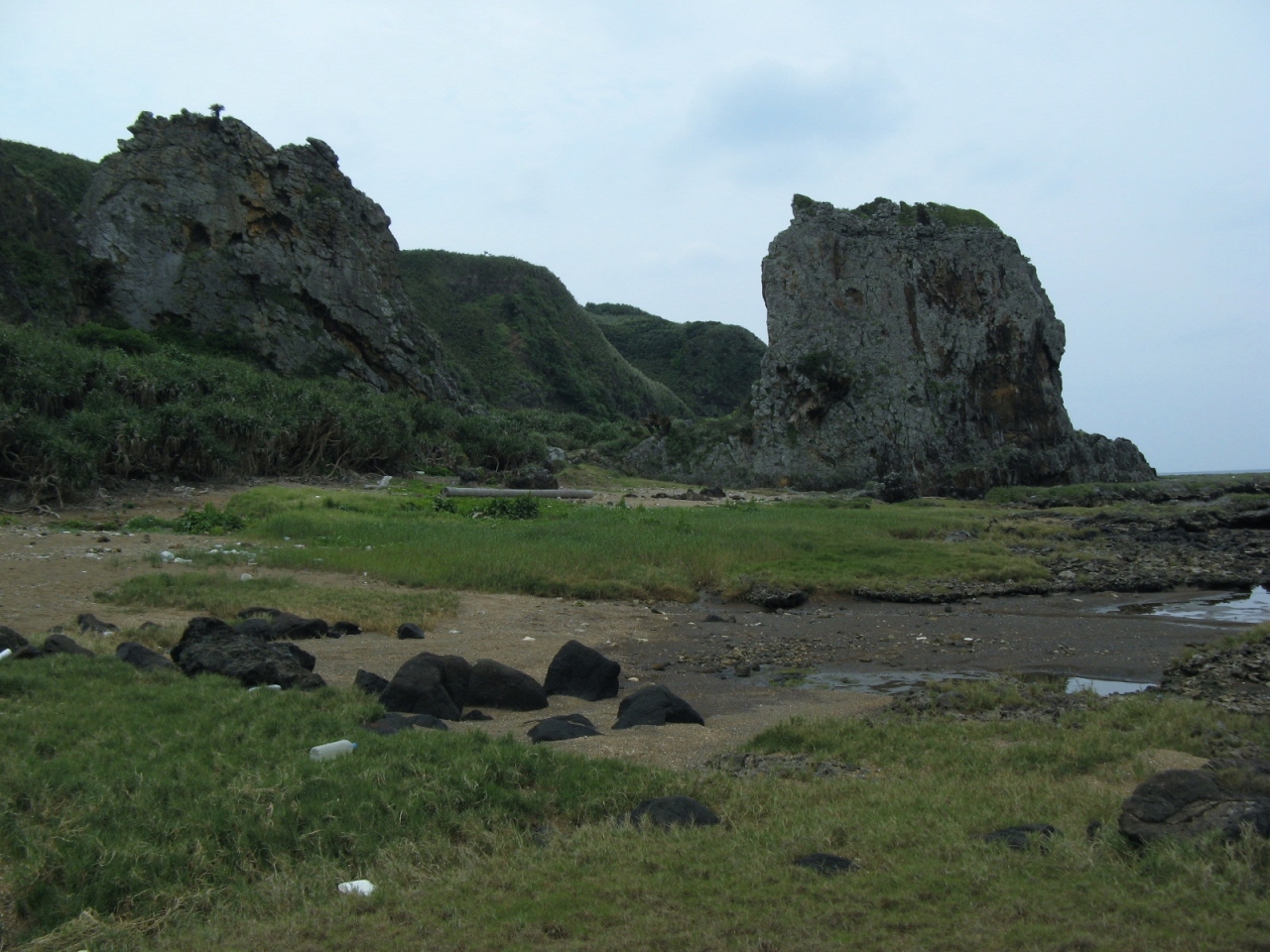 見えるところまで行くまでが大変でした。駐車場から250段ほどの階段を下り、一応遊歩道として整備されているのですが、草が生い茂ったり、所どころじゅるじゅるにぬかるんだ道を進まねばなりません。途中、足元に大きなカニ穴の様なものが沢山あったりして、ハブが出てくるのではと、ビクビクしながら歩いた先に、“タチジャミ岩”がありました。4月上旬に訪れたのですが、人っ子一人おらず静かで雰囲気のある良いところでしたが、海岸にゴミや漂流物が打ち上げられていたのは少し残念でした。