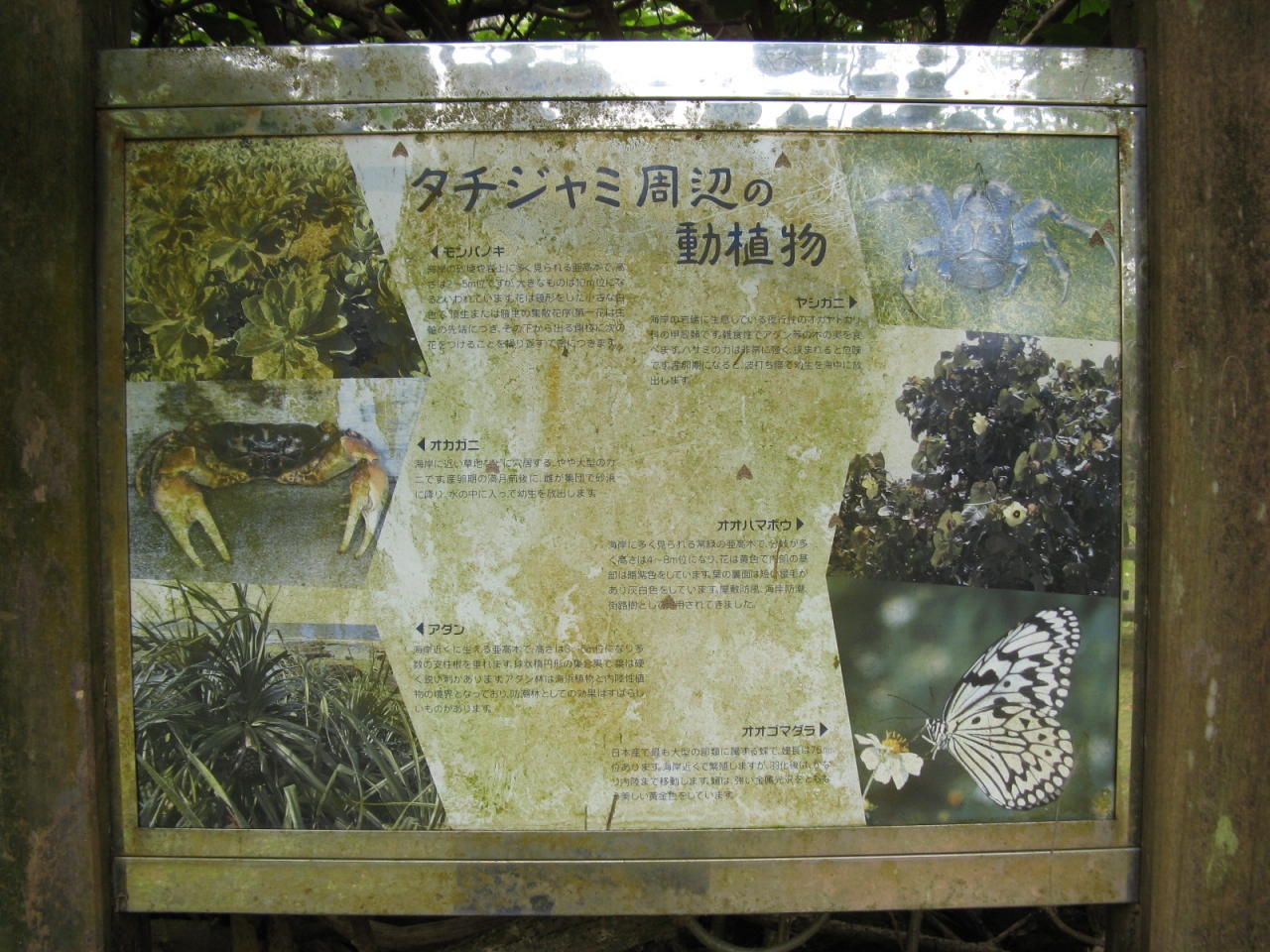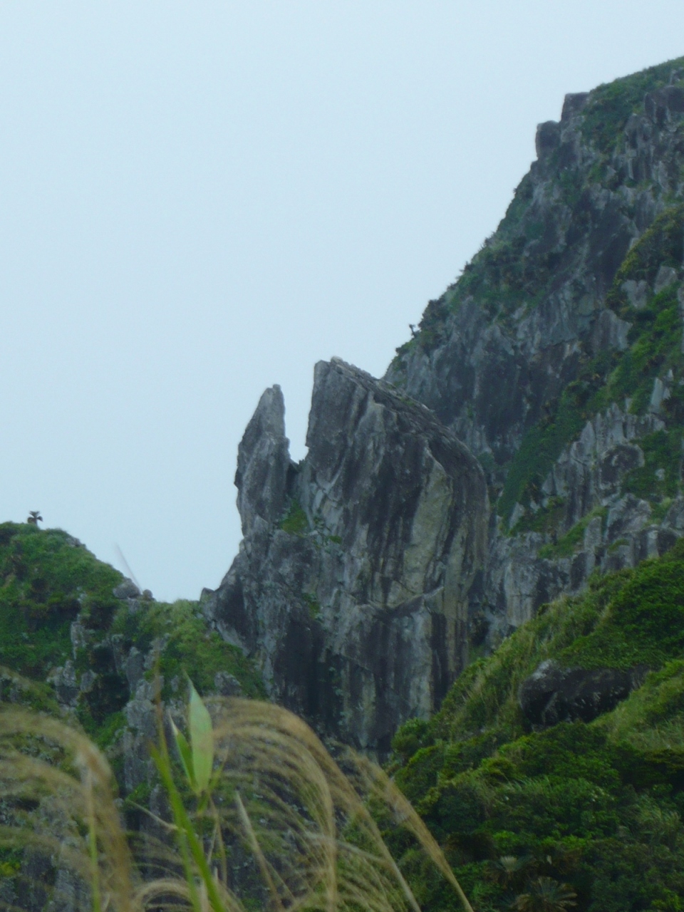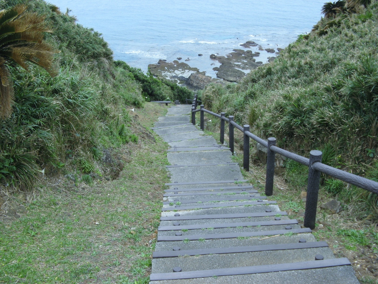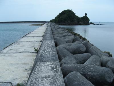 見えるところまで行くまでが大変でした。駐車場から250段ほどの階段を下り、一応遊歩道として整備されているのですが、草が生い茂ったり、所どころじゅるじゅるにぬかるんだ道を進まねばなりません。途中、足元に大きなカニ穴の様なものが沢山あったりして、ハブが出てくるのではと、ビクビクしながら歩いた先に、“タチジャミ岩”がありました。4月上旬に訪れたのですが、人っ子一人おらず静かで雰囲気のある良いところでしたが、海岸にゴミや漂流物が打ち上げられていたのは少し残念でした。