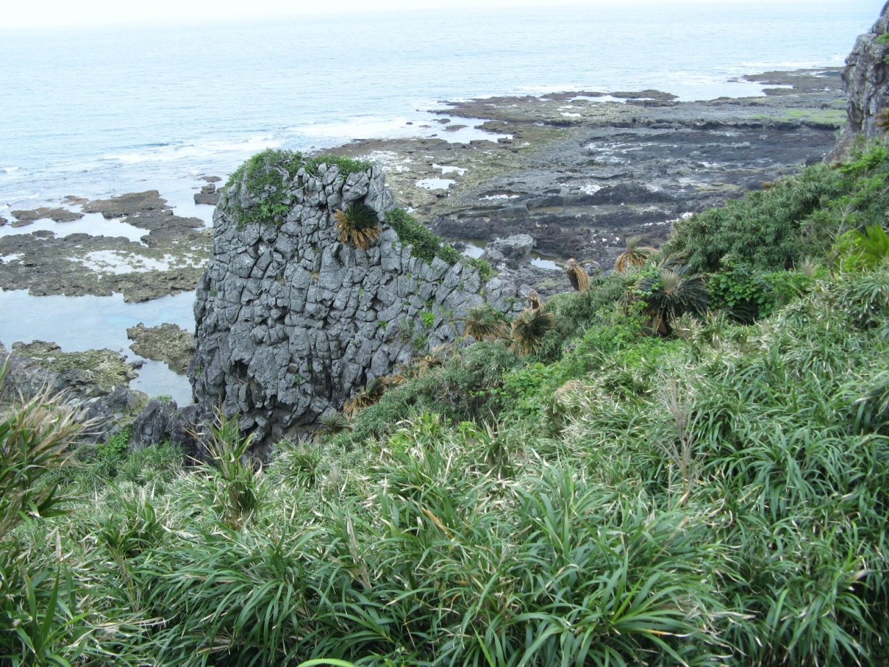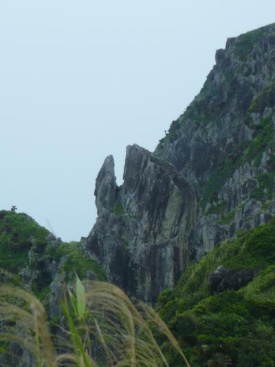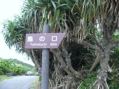 久米島の最南端、島尻崎に立つ鳥がクチバシを開けたような形をした奇岩です。駐車場の傍に『鳥の口まで660m』と云う標識があり、それにしたがって遊歩道を進めば迷う事なくたどり着けます。遊歩道の途中でもクチバシは望めますが、クチバシの背後に岩場が重なって見えてしまうので、そのシルエットがぼやけてしまいます。標識から5分ほど歩くと、クチバシがはっきり見えてきます。“鳥の口”と言うよりは、魚が上を向いて口を開いているように見えました。遊歩道からは変化に富んだ自然の景観を楽しむことが出来ます。