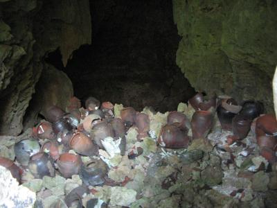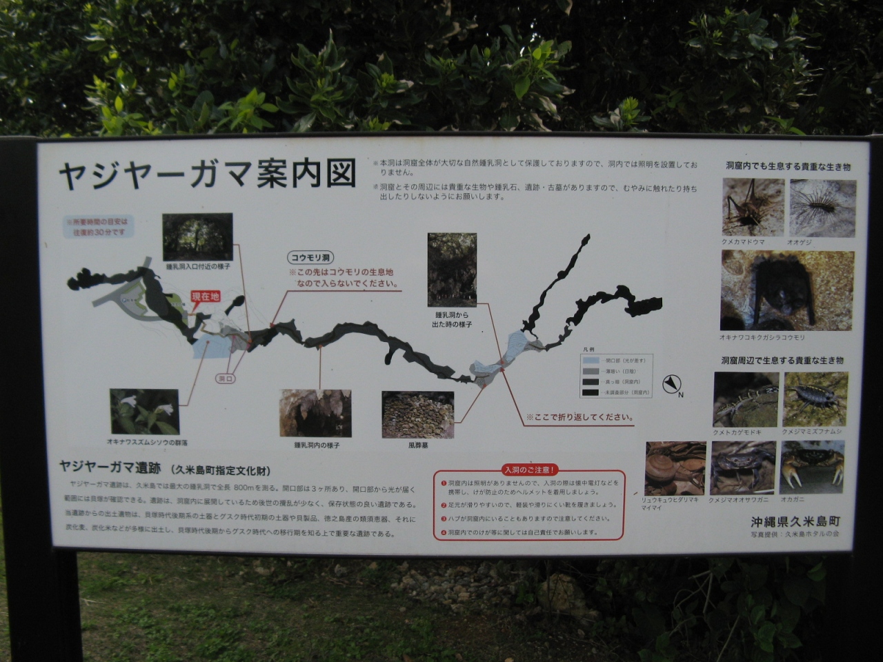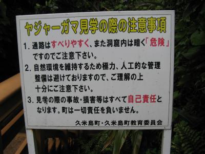 久米島最大、長さ800mの鍾乳洞です。駐車場や案内板が整備されていますが、何故か空港で手に入れた久米島ガイドマップには掲載されておらず、久米島町も積極的に広報していないように思われました。と言うのも、ここは単なる鍾乳洞ではなく、風葬(墓所)としての役割を担っている場所であることが入り口にある案内板(添付写真参照)に示されていてることから理解できました。