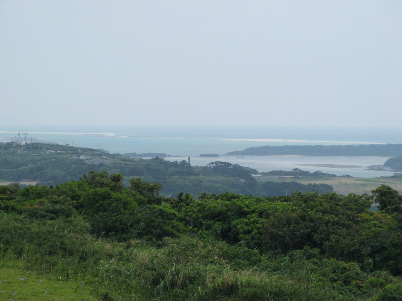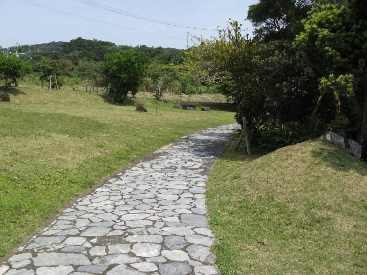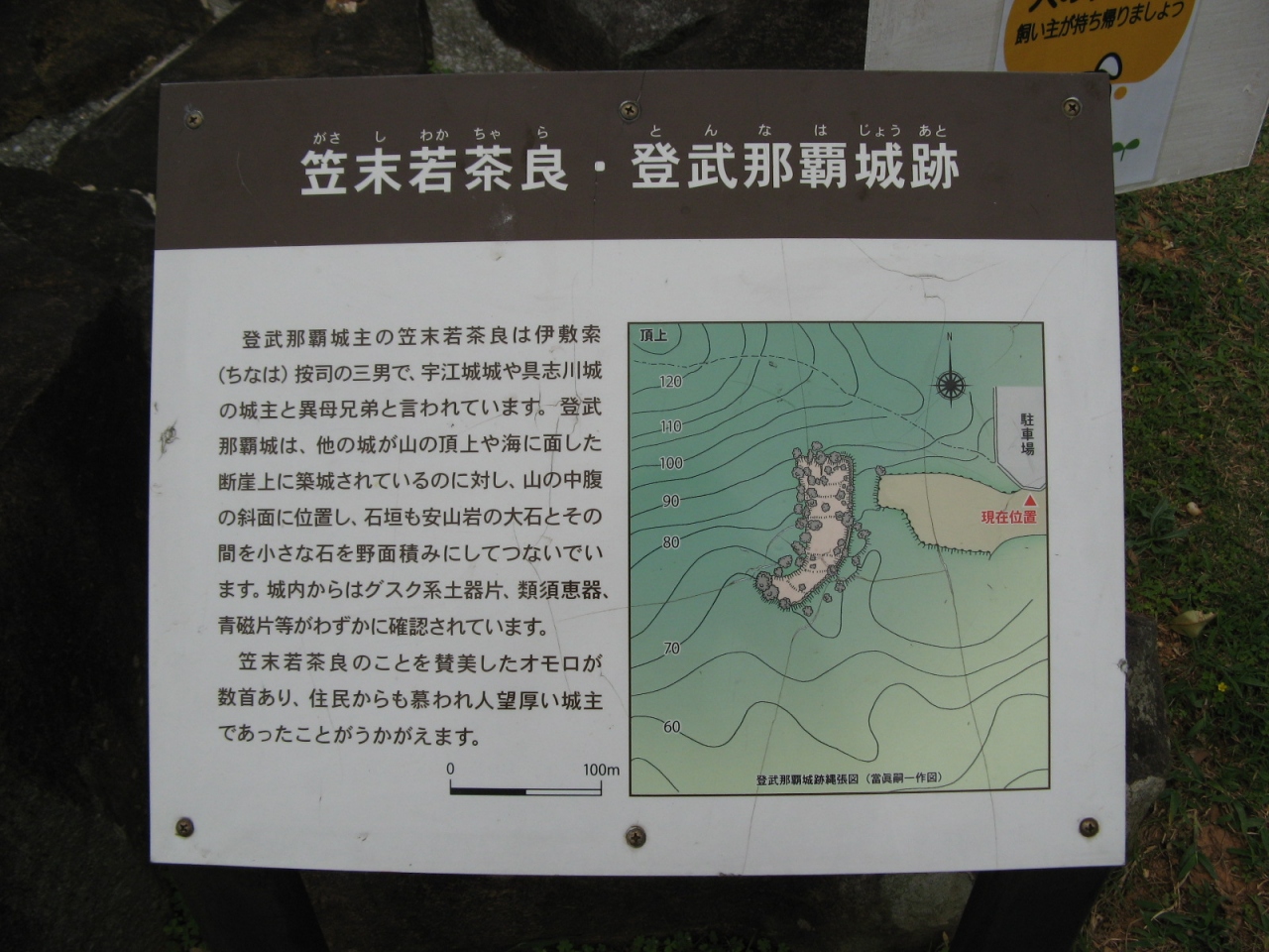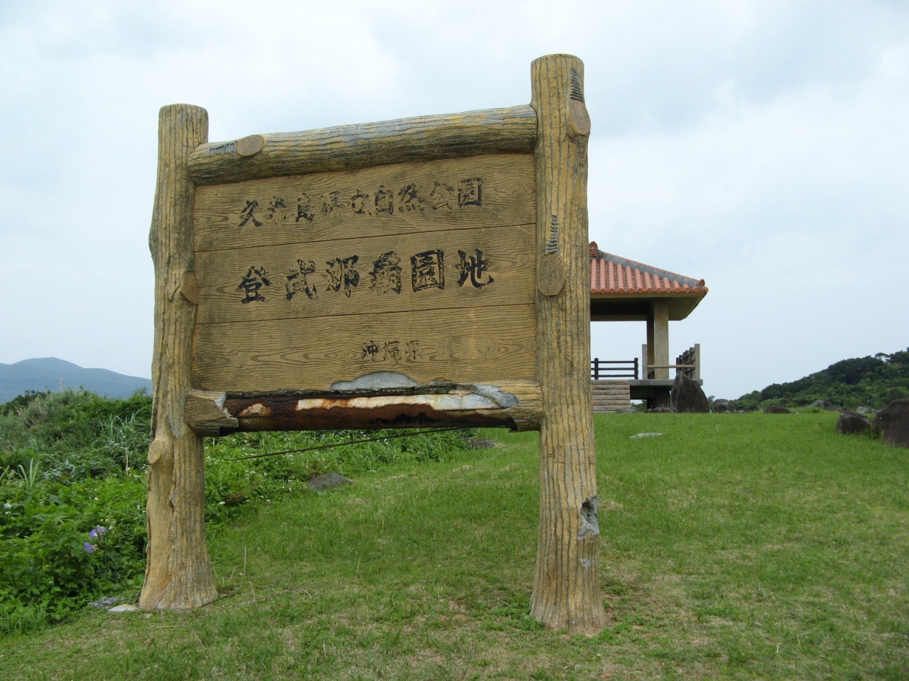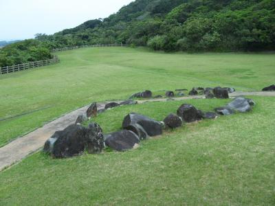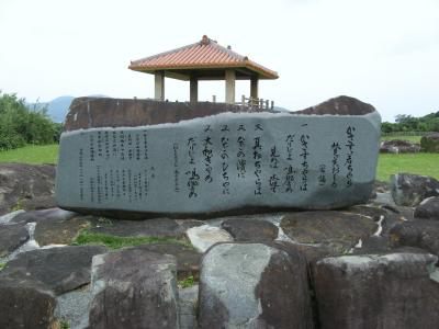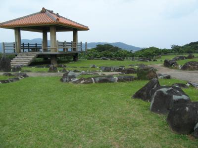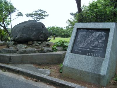 琉球王朝の時代に久米島を支配した一族によって築かれた登武那覇城の跡を緑地公園として整備されたものです。城跡と言っても建物や石垣の様なものは全くなくて、芝生が敷き詰められ、大小の石が並べられあたかも石庭の様な趣です。公園の入り口には、城を築いた笠末若茶良を讃えるおもろ歌謡が刻まれている大きな自然石の碑(添付写真参照)があります。訪れたときは少し天気が悪かったが、ハテの浜を見ることができました。