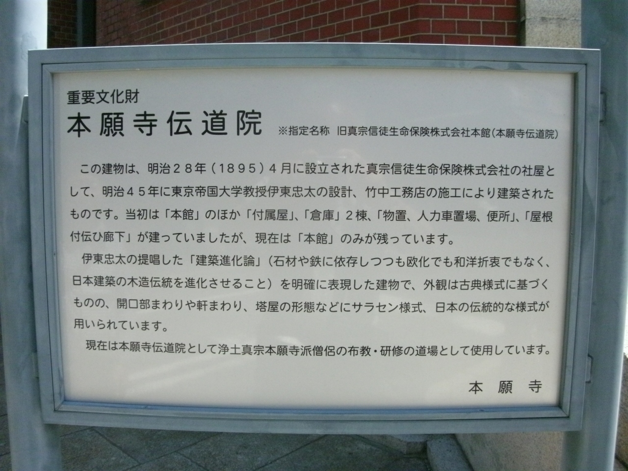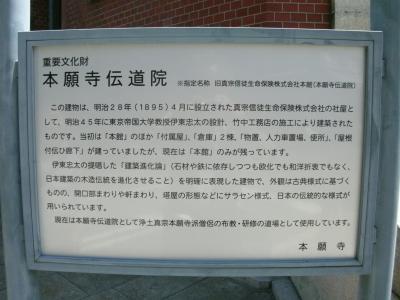 西本願寺の御影堂門から堀川通りを越え、正面通を100mほど歩いた右手にあります。赤いレンガ造りのモダンな建物で、案内板(添付写真参照)には『明治45年、東京帝国大学教授伊東忠太の設計、竹中工務店の施工により建築、現在は浄土真宗本願寺派僧侶の布教・研修の道場として使用されている』と記載されています。