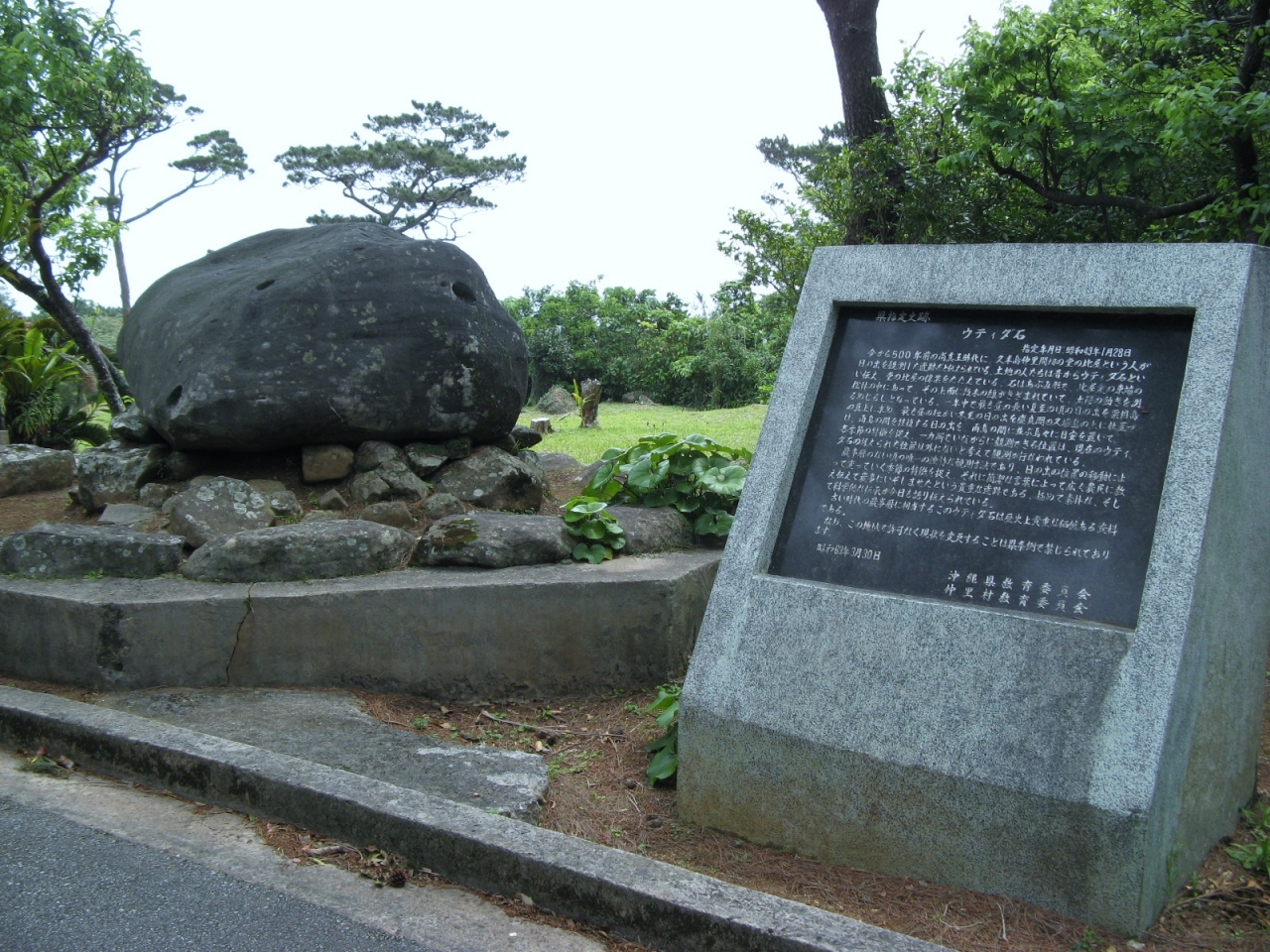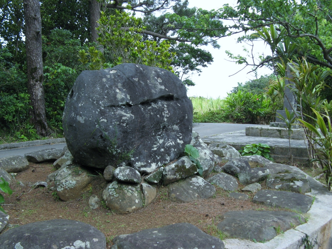 “比屋定小学校”の前の信号から県道242号線(外周道路)を右回りに300m余進むと、道路の右端にポールの先に「太陽石」と記した標識があります。それに従って、左手の間道を約100m進むと右手に「太陽石」があります。