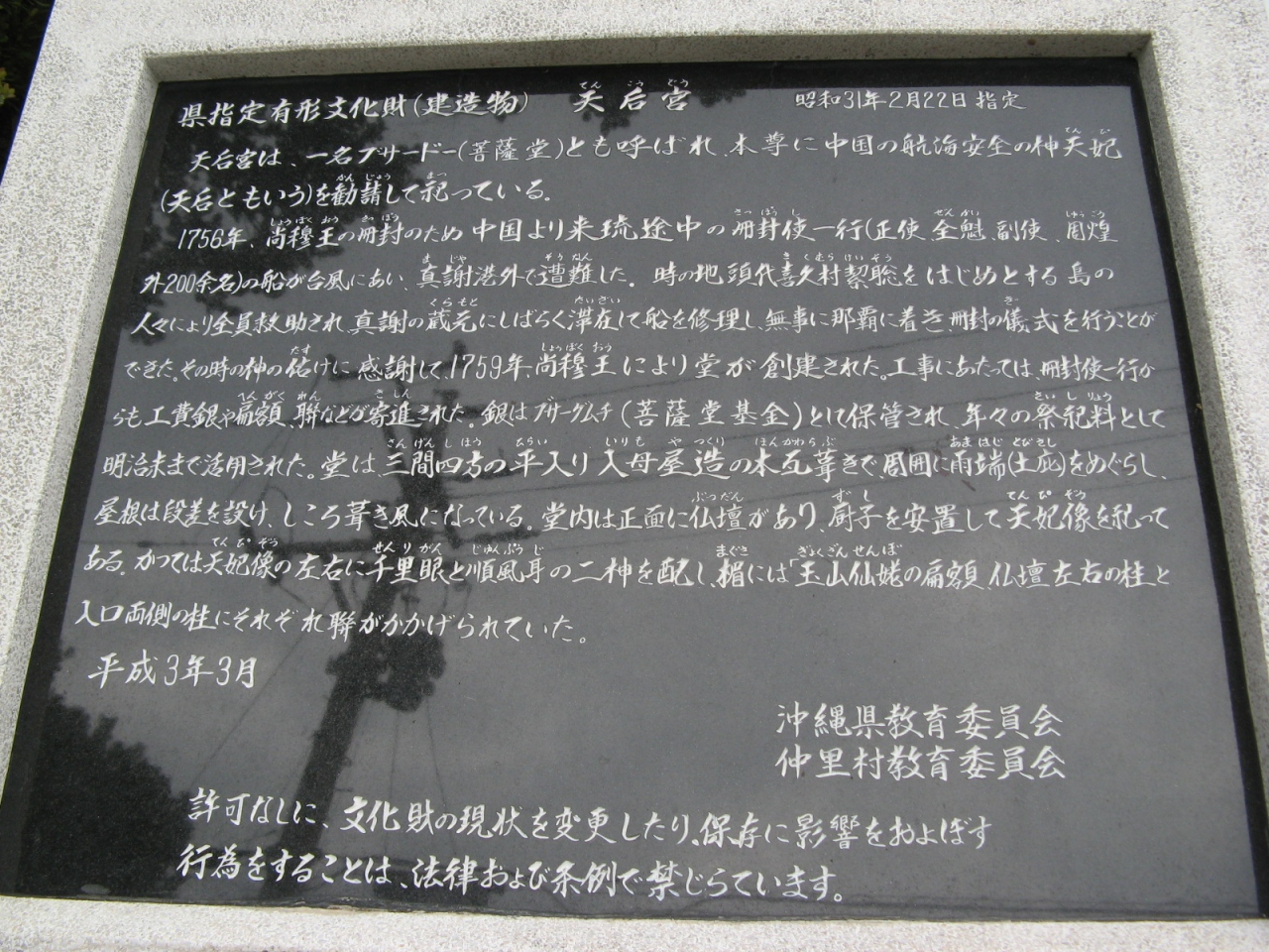 現地にある説明板(添付写真参照)には『別名、菩薩堂とも呼ばれ、本尊に中国の航海安全の神、天妃を祀ってある。1756年、中国から来た冊封使一行の船が久米島真謝港外で遭難、その際、久米島の人々が一行全員を救出、船も修理して無事那覇に着き冊封の儀式を行うことができた。そのことに感謝した一行からの寄進の下、琉球王によって堂が建立された』ということが書かれています。