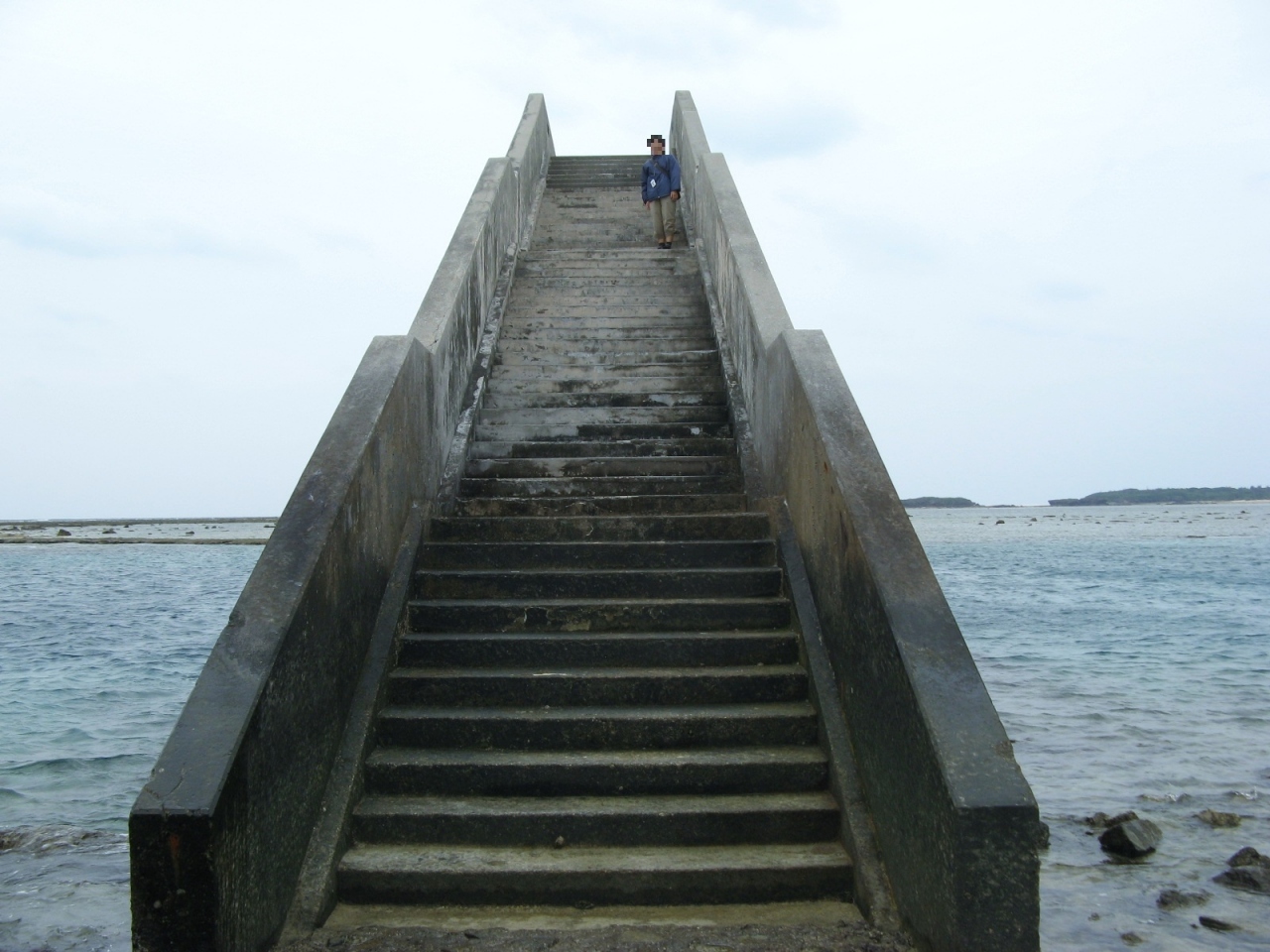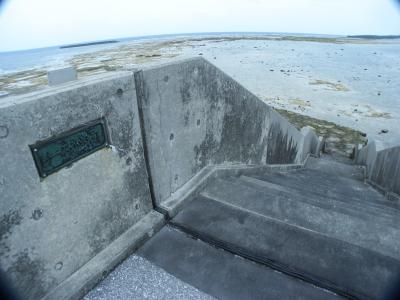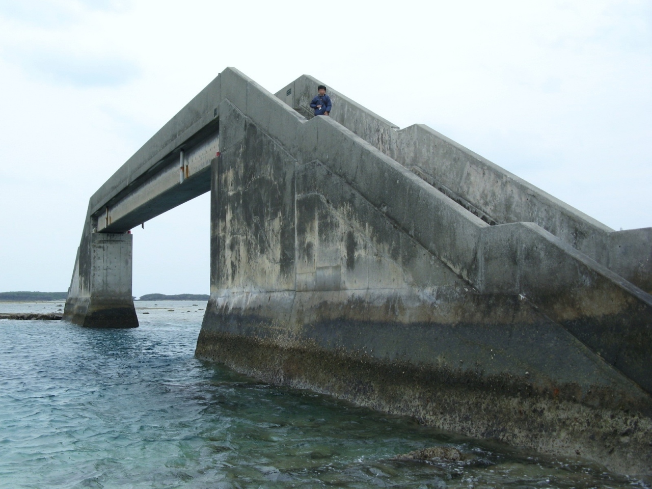 潮が満ちているときは海に歩道橋がある風景、でも干潮時はこの橋を利用すれば久米島から奥武島まで新奥武橋を使わないでも渡ることができます。