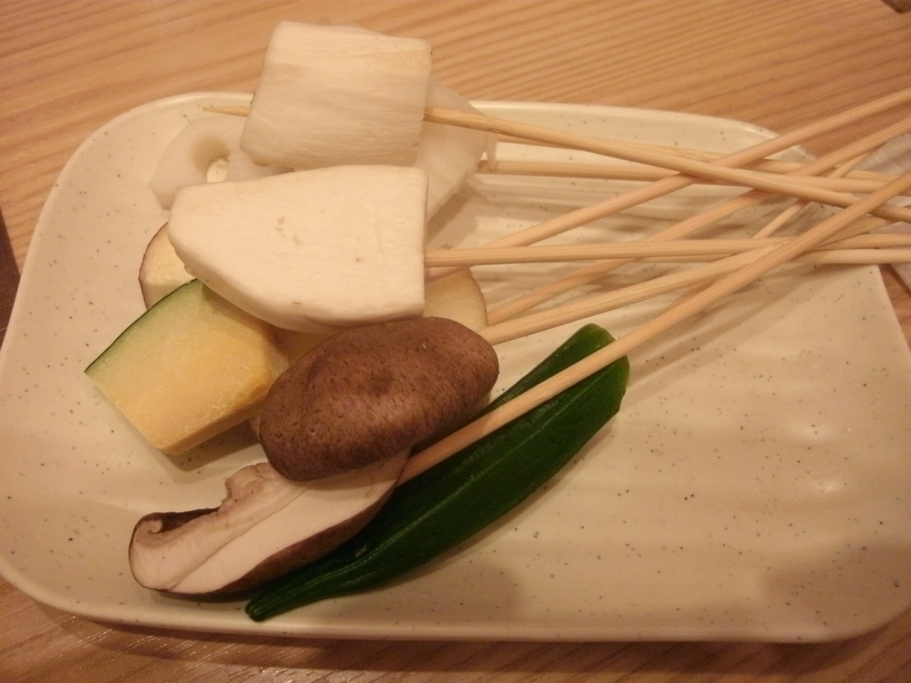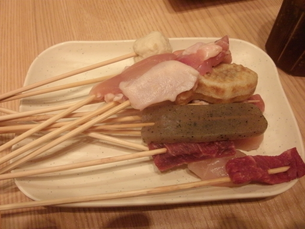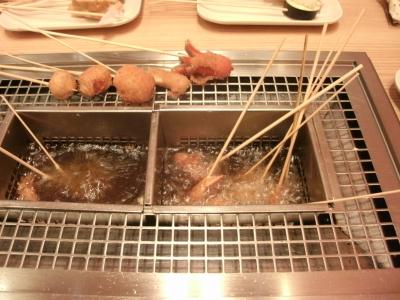 海老、牛肉、豚肉、鶏肉、イカ、軟骨、蓮根、薩摩芋、椎茸、エリンギ、カボチャ、たこ焼き、つくね等、30種類ほどの串ネタを選び、自分のテーブルで衣をつけて揚げるスタイルです。揚げた串は、甘口、辛口、チーズなどのソースやポン酢など食材に合わせて色んな味付けを楽しむことができます。