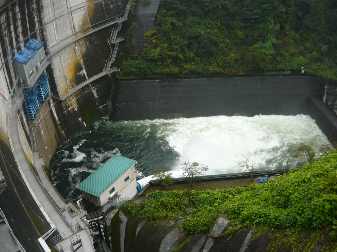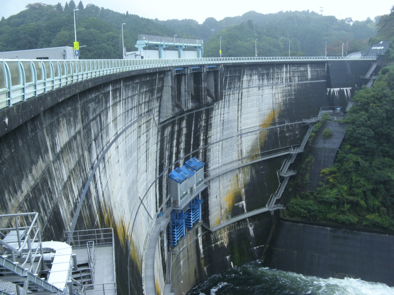 竣工が1970年と比較的古く、常用洪水吐に高圧キャタピラゲート2門、非常用洪水吐にローラゲート3門、河川維持ホロージェットバルブ1門を装備しており、堤体は年数を経た風格があります。