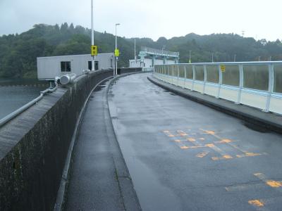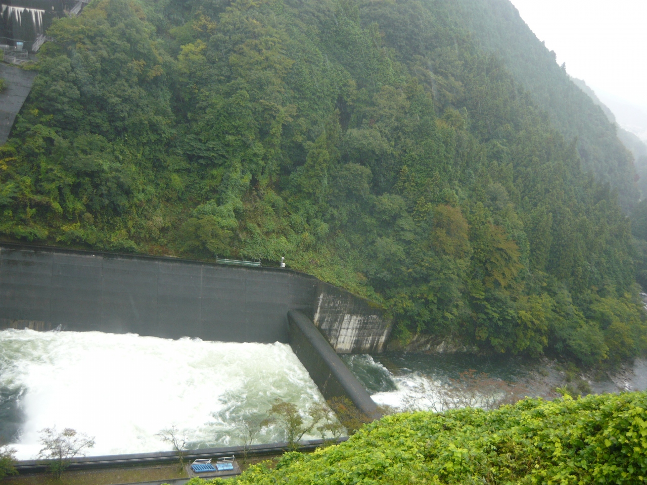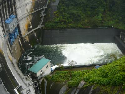 ダム堤体上は車は通行不可になっていて歩いて観て回りました。高さが30mほどなので、ダム堤体上から下流側を覗いてもそれほど迫力はありませんが、常用洪水吐から放水しているところを観ることができました。