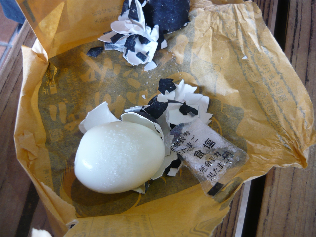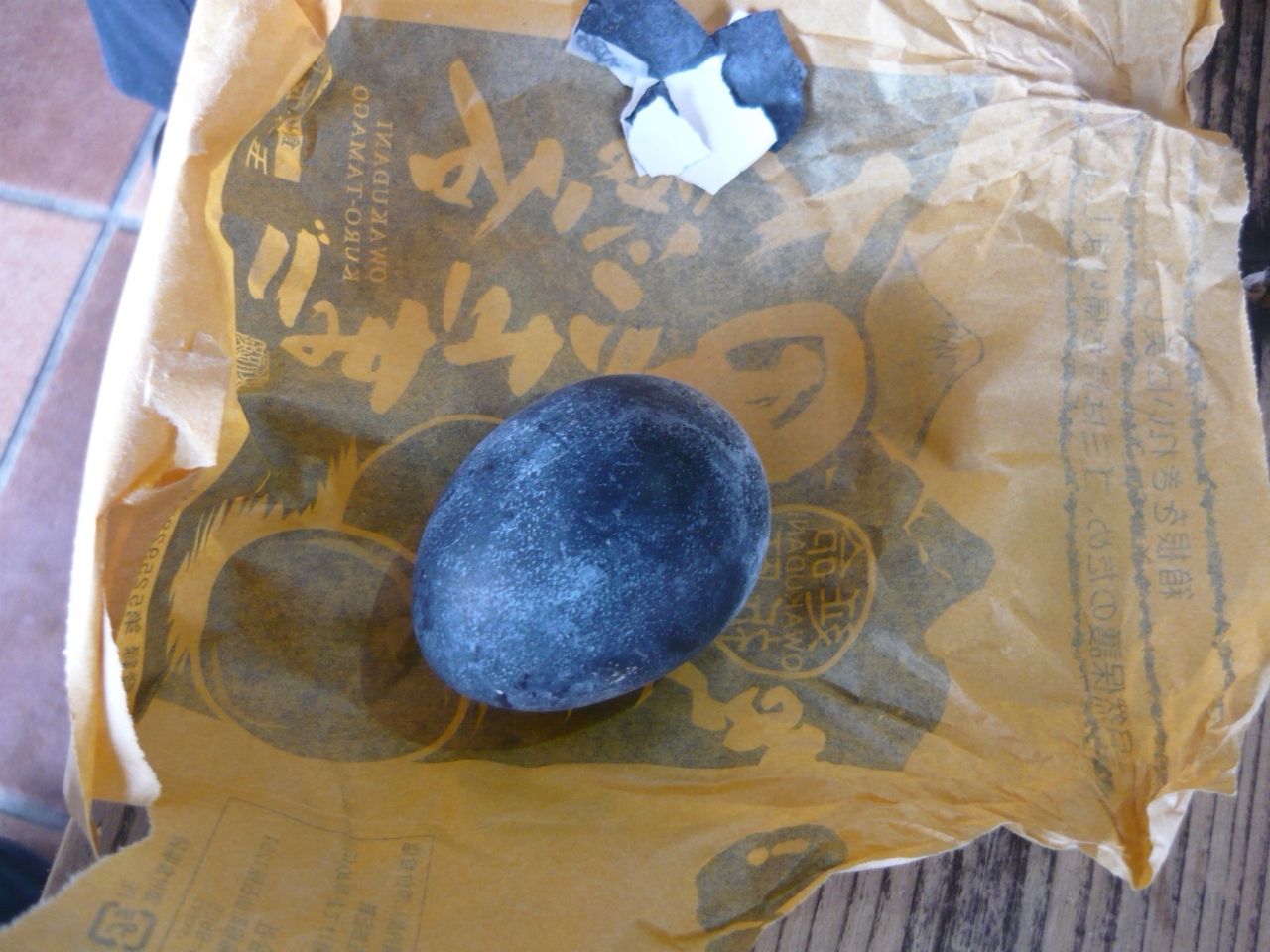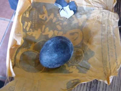売り場に、『1個食べると7年寿命が延びるらしい・・・』と表記された黒タマゴはバラ売りしておらず5個入り(500円)のものを買わなければなりません。友人と分け合って頂きましたが、見かけはともかく、味は普通の茹でタマゴと変わりませんでした。