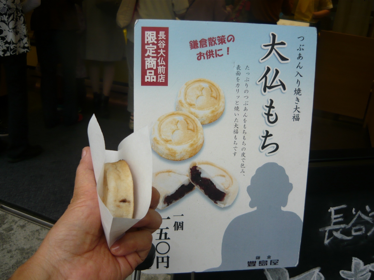 鎌倉土産の定番である“鳩サブレー”で人気の豊島屋の「長谷大仏前店」です。こちらの限定商品である“大仏もち 150円/個”を購入しました。硬くなるのでお土産用として箱入りは売ってなくて、1個売りになっています。散策しながら頂きましたが、アツアツで表面はカリッとしていて、皮はもっちり、粒餡たっぷりの“大仏もち”は美味しかったです。このお店では“鳩サブレー”も良いですが、散策のお供に“大仏もち”もオススメです。