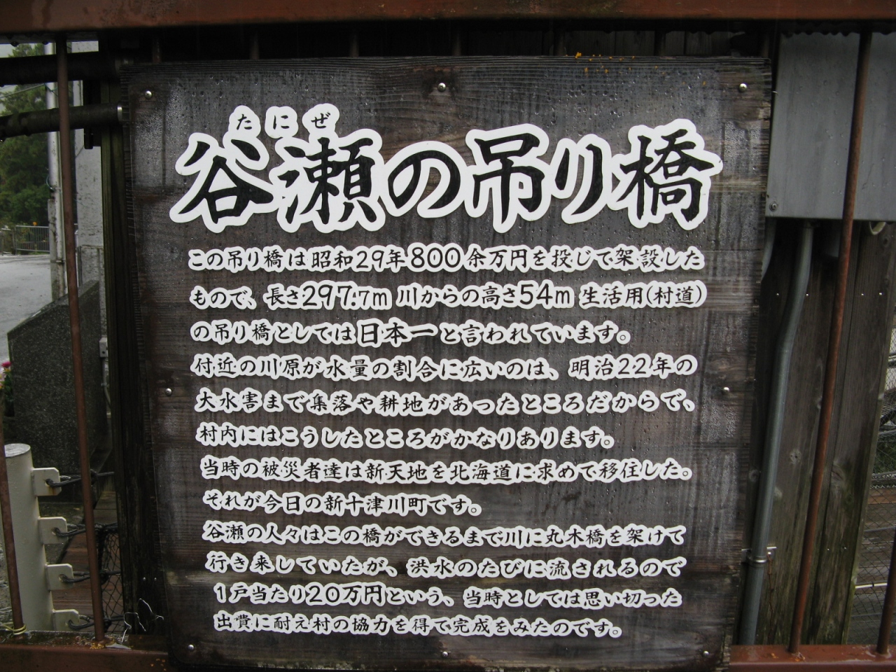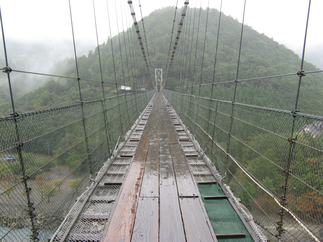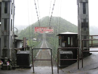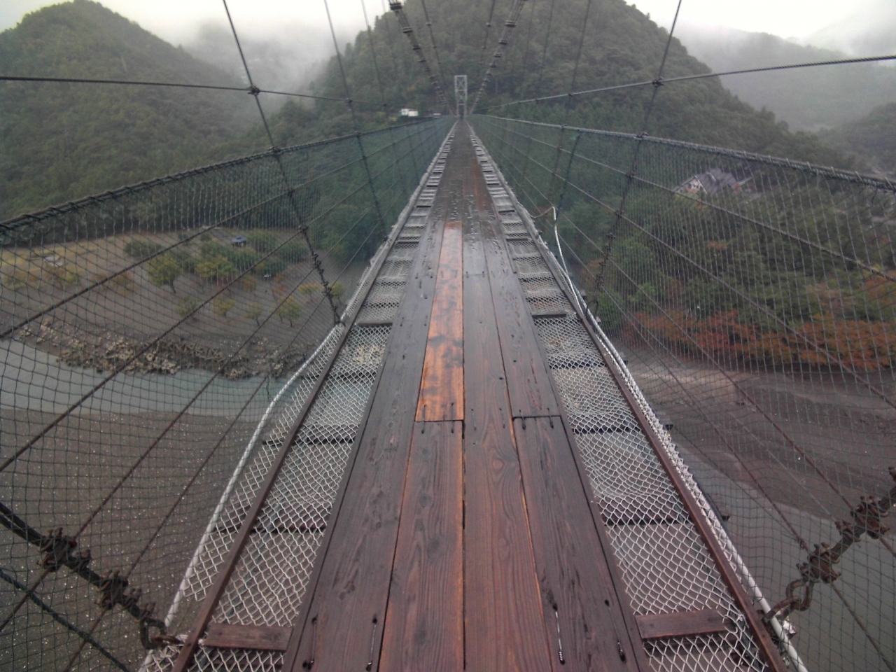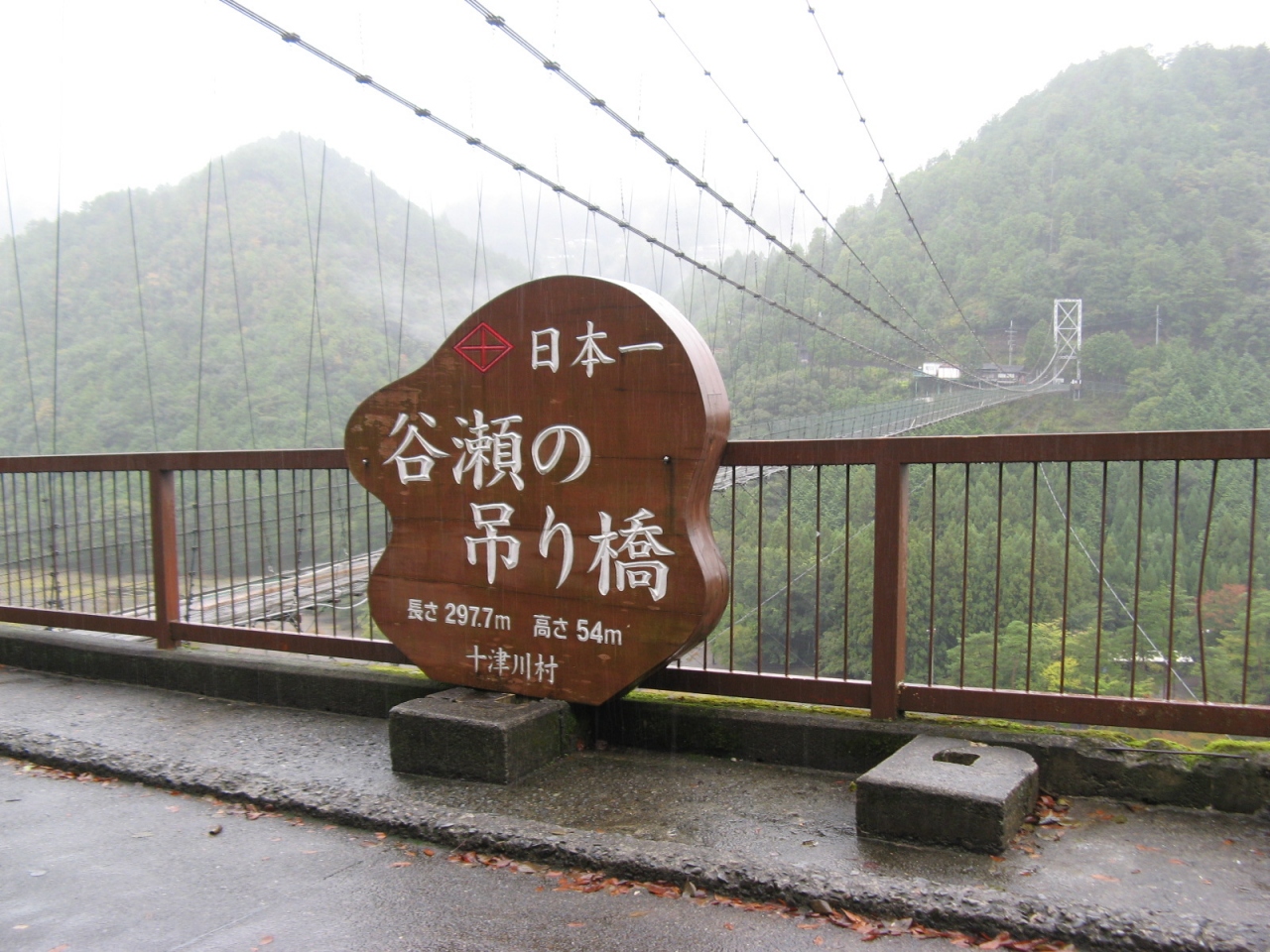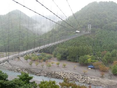 熊野川(十津川)に架る、長さ297.7m、川面からの高さ54m、生活用吊り橋としては日本一の長い吊り橋です。