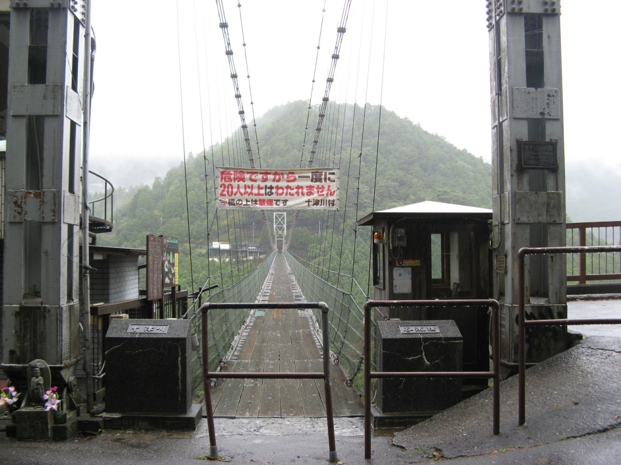 橋の渡口に『一度に20人以上は渡れません』と注意書きがあります。橋の幅は2mほどで中央部分に木製の歩道部分があり、その外側は下の川が見える金網で造られています。