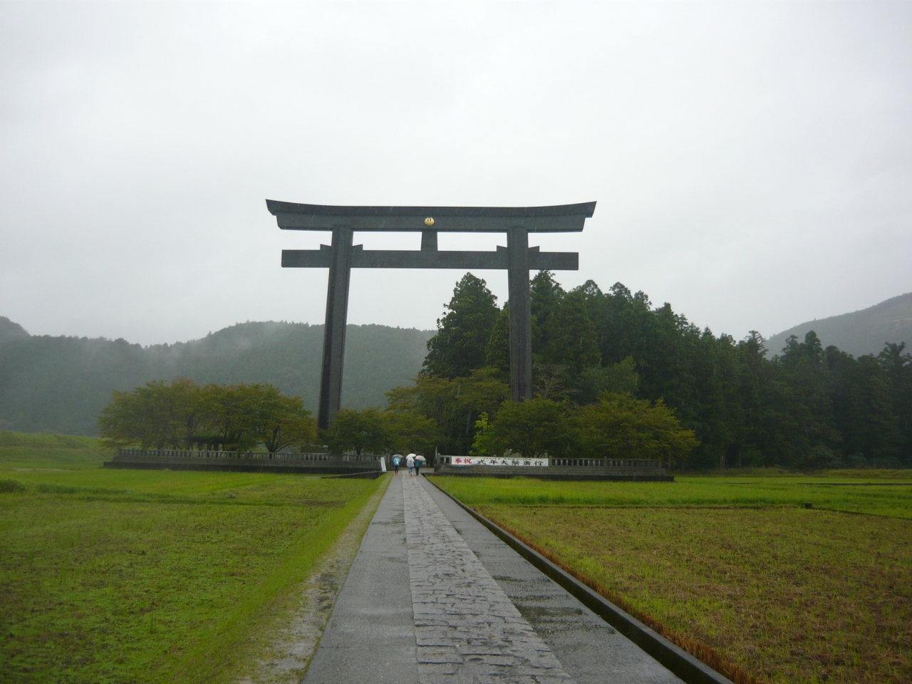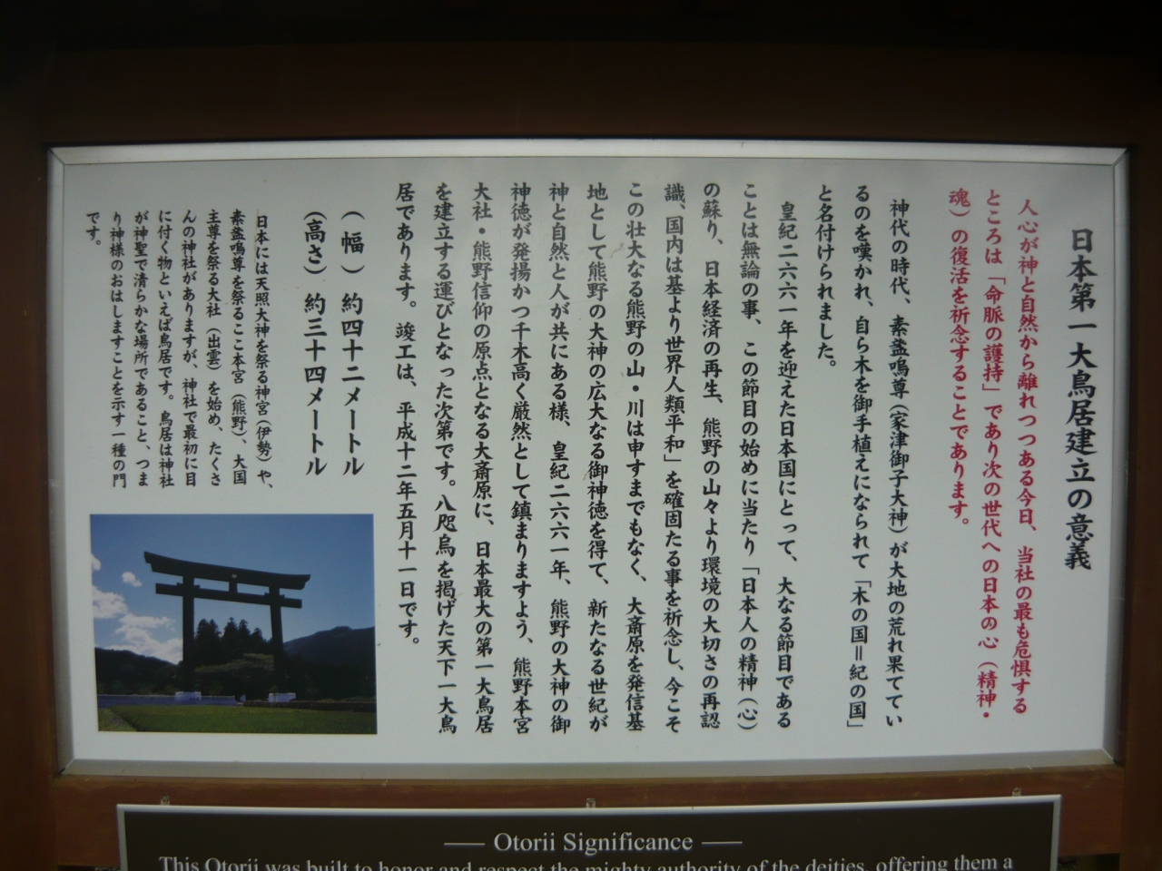 熊野本宮大社の入り口付近に『大斎原 徒歩5分』と書かれた案内板があり、その方向に従って、道路を渡って進んでいくと、大きな鳥居が見えます。その背後のこんもりとした森が大斎原です。大鳥居は、高さ約34m、幅約42mもあって周りが田んぼということもあり、その存在が遠くからも確認できます。大斎原には社殿などの建物は無く、石の祠や狛犬があるのみで一見公園のような感じがするところですが、パワースポットと言われるだけあって心が洗われるような雰囲気のあるところでした。熊野本宮大社を訪れたら、是非、訪ねられることをオススメします。- 旅行時期
