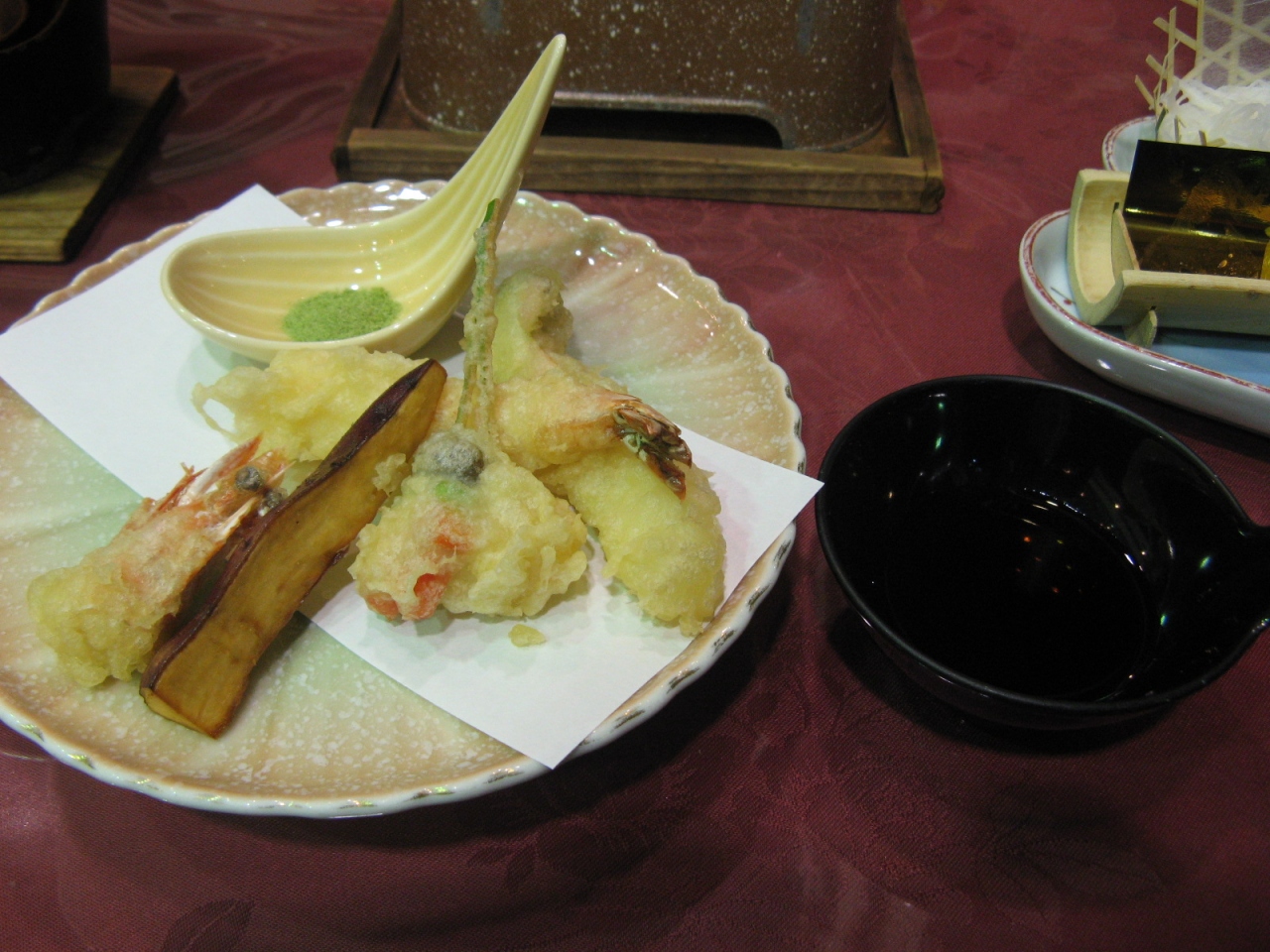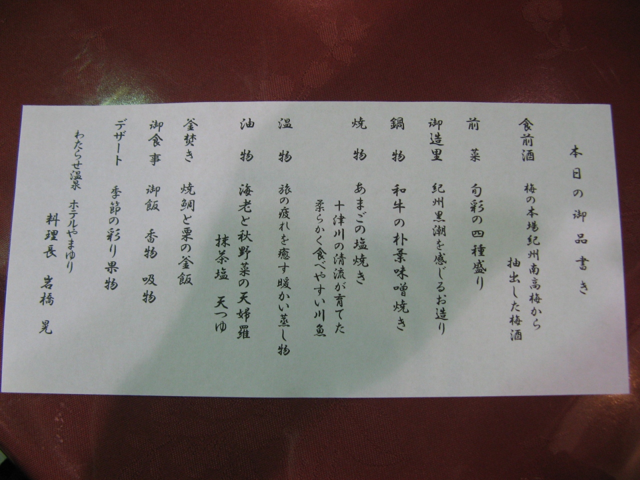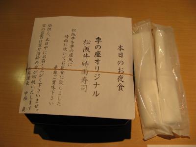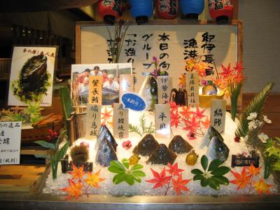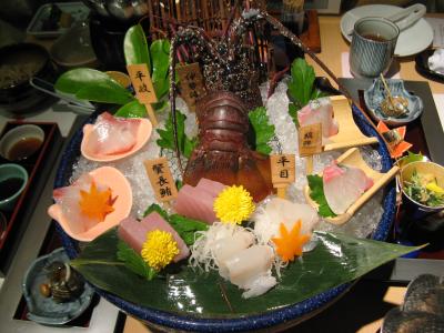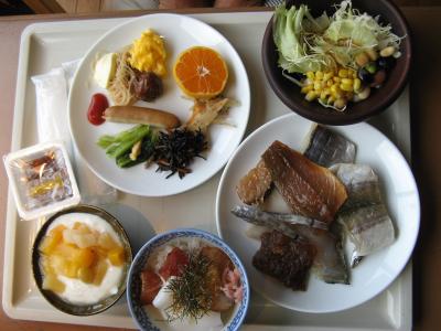 食事は歩いて3~4分(連絡すれば迎えに来てくれる)の本館のレストランで頂きました。夕食はレストラン入り口に“本日の旬魚”と明示している魚から刺身2種などを好みで選ぶことができました。献立は、地元の魚介を中心にした懐石風料理で、とても丁寧に造ってあって、ボリュームもあり新鮮でおいしかった。また、夜食用として小さなおにぎりを箱詰めにしたものが提供されるなど、客をもてなそうとする心配りに好感が持てました。