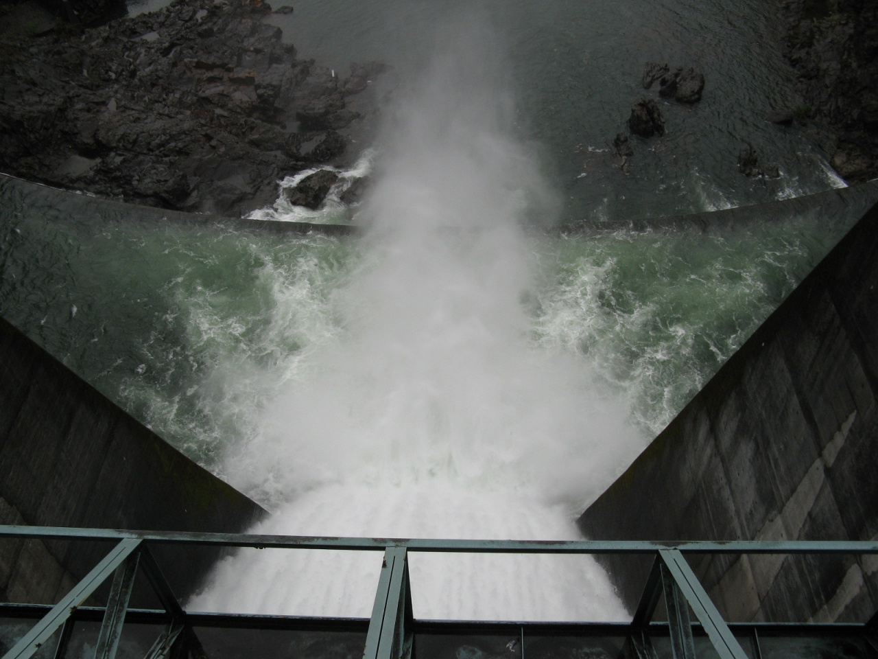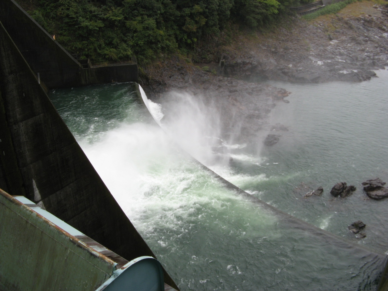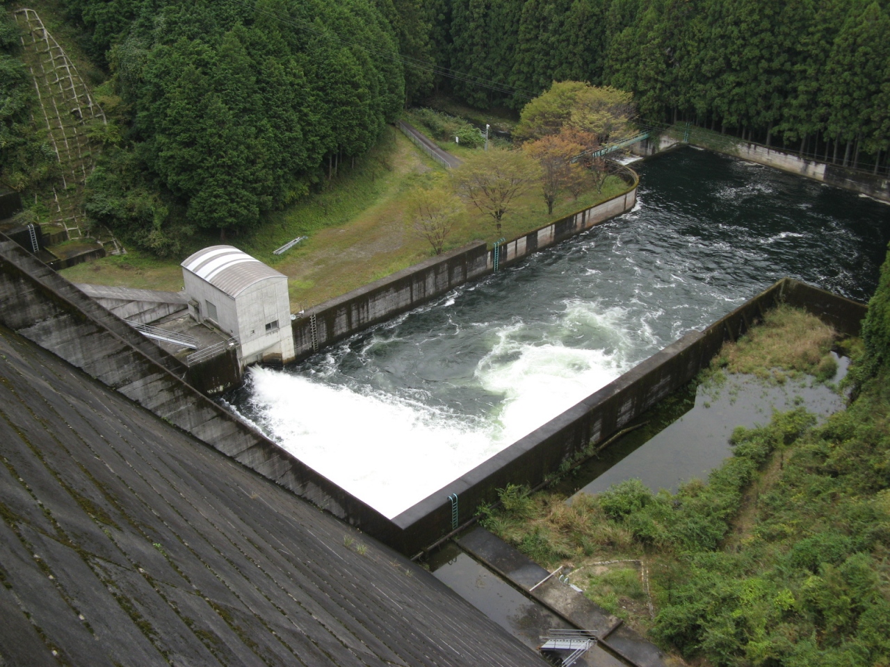 竣工が1962年と比較的古く、洪水吐は巨大なローラーゲート4門を装備していて、訪れたときはジェットフローゲートから河川維持用水の放流中でした。