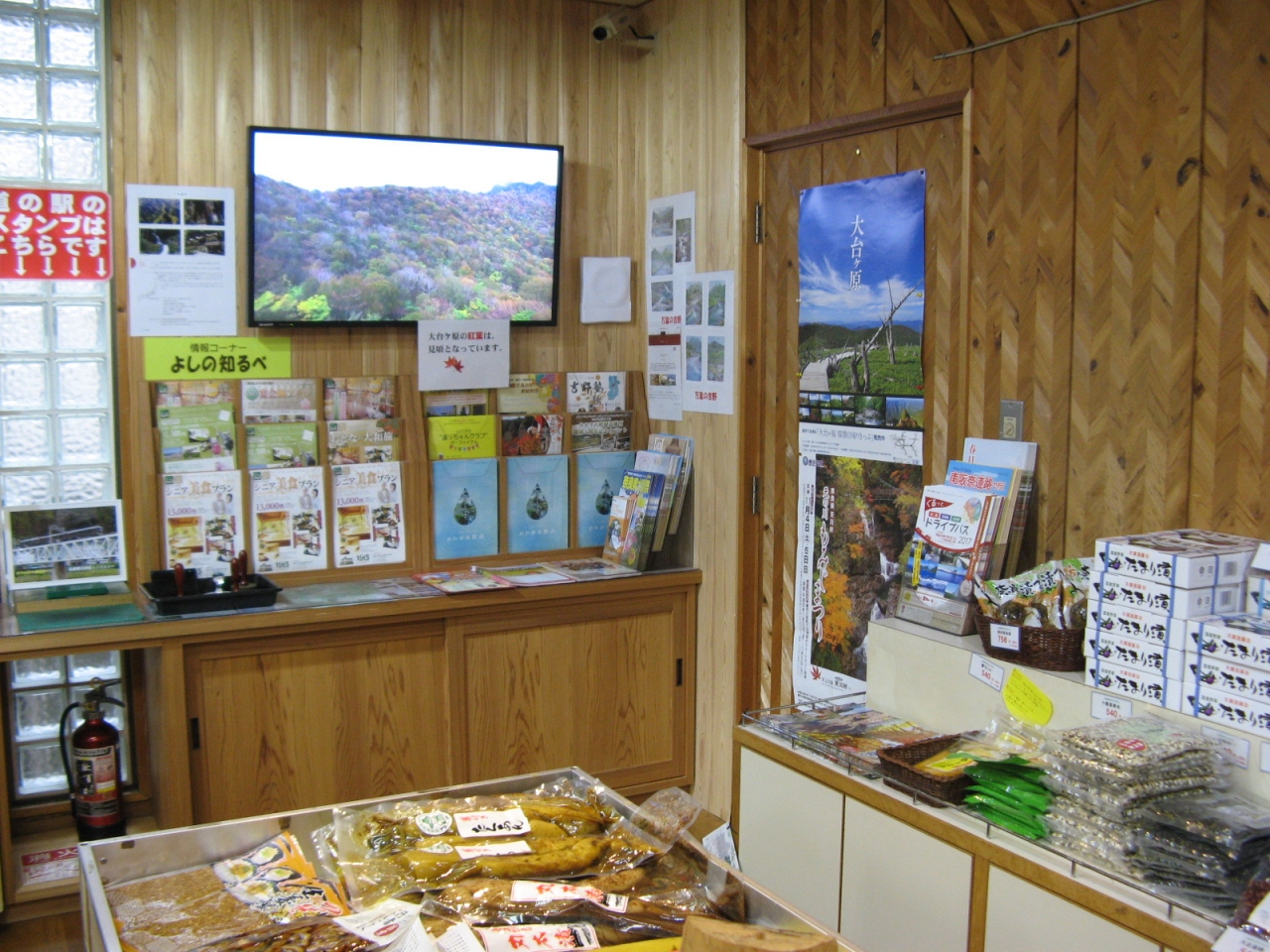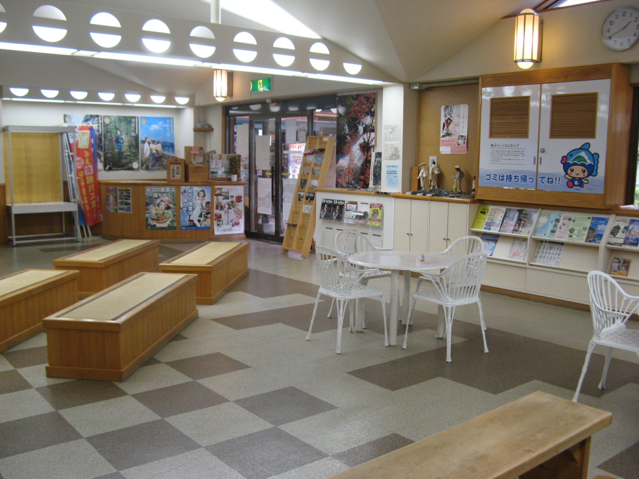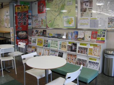 道の駅としては規模はそれほど大きくはありませんが、直産野菜や果物を販売するコーナーやお土産品販売コーナー、喫茶、レストラン、情報コーナーなど一通りそろっています。情報コーナーはベンチやテーブルが置かれていて狭いながら使い勝手が良かったです。