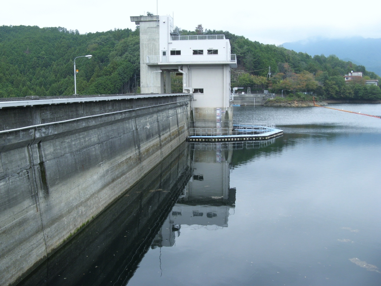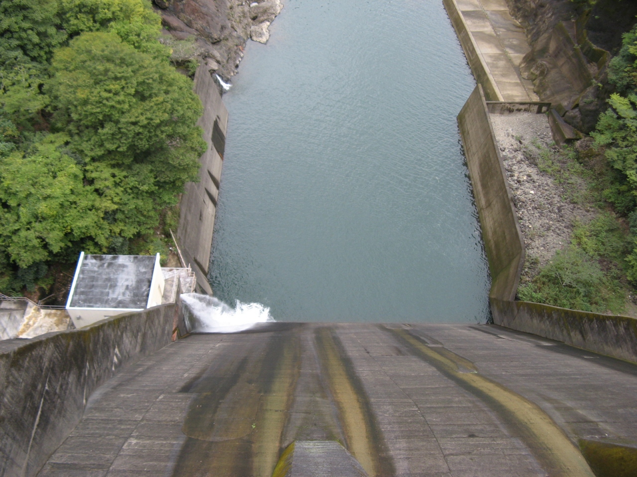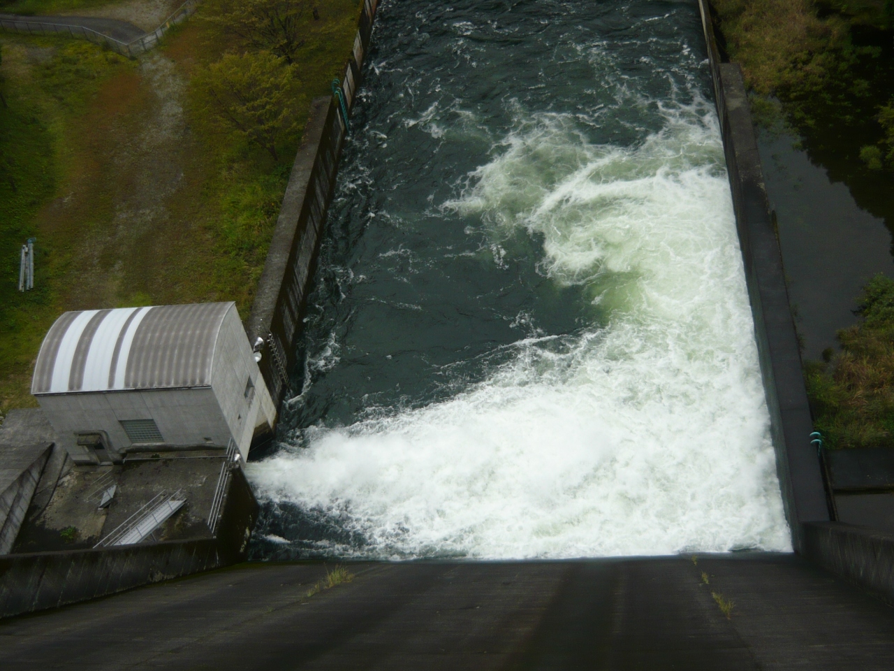 ダム堤体に洪水吐(ダム湖の水を下流に流すためのゲート設備)はなく、洪水吐と発電の取水設備はダム堤体から少し離れたダム湖の中にあります(添付写真を参照ください)。