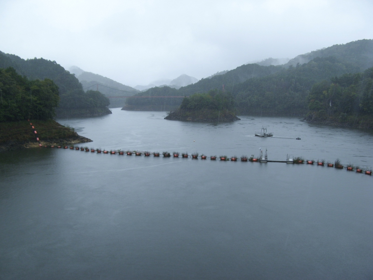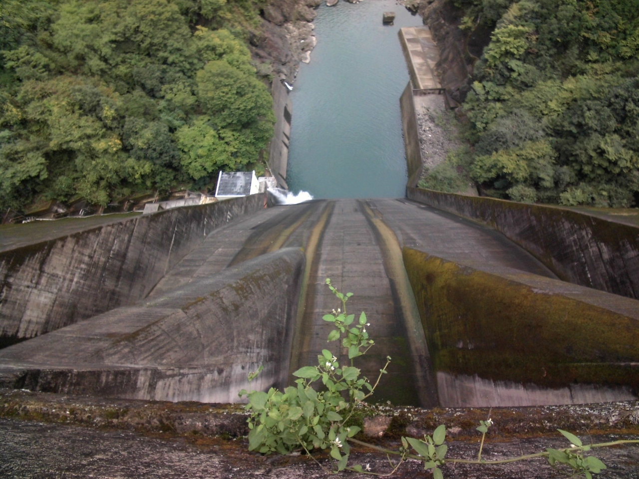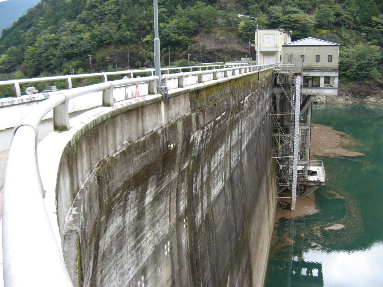 ダム堤体に洪水吐(ダム湖の水を下流に流すためのゲート設備)はなく、洪水吐と発電の取水設備はダム堤体から少し離れたダム湖の中にあります(添付写真を参照ください)。