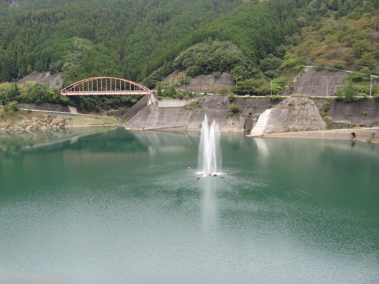 ダム堤体上は車の通行が可能で、堤体上から下流側を覗くとそこそこ迫力があり、右岸には発電所も見ることができました。また、ダム湖側には表層曝気循環装置と言うダム湖の水を噴水状にして空中に噴き上げることで淡水赤潮の原因となる植物プランクトンを抑制する装置が稼働している様子も見ることができました。ダムサイト右岸側にダム管理所と駐車場があります。管理所の傍に展望台に至る道があります。登りは少々きついですが、ダムの全景を見渡すことができますので天気の良い日は展望台まで上がられることをお勧めします。