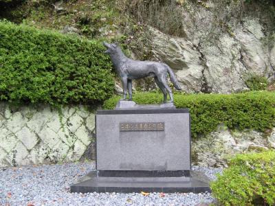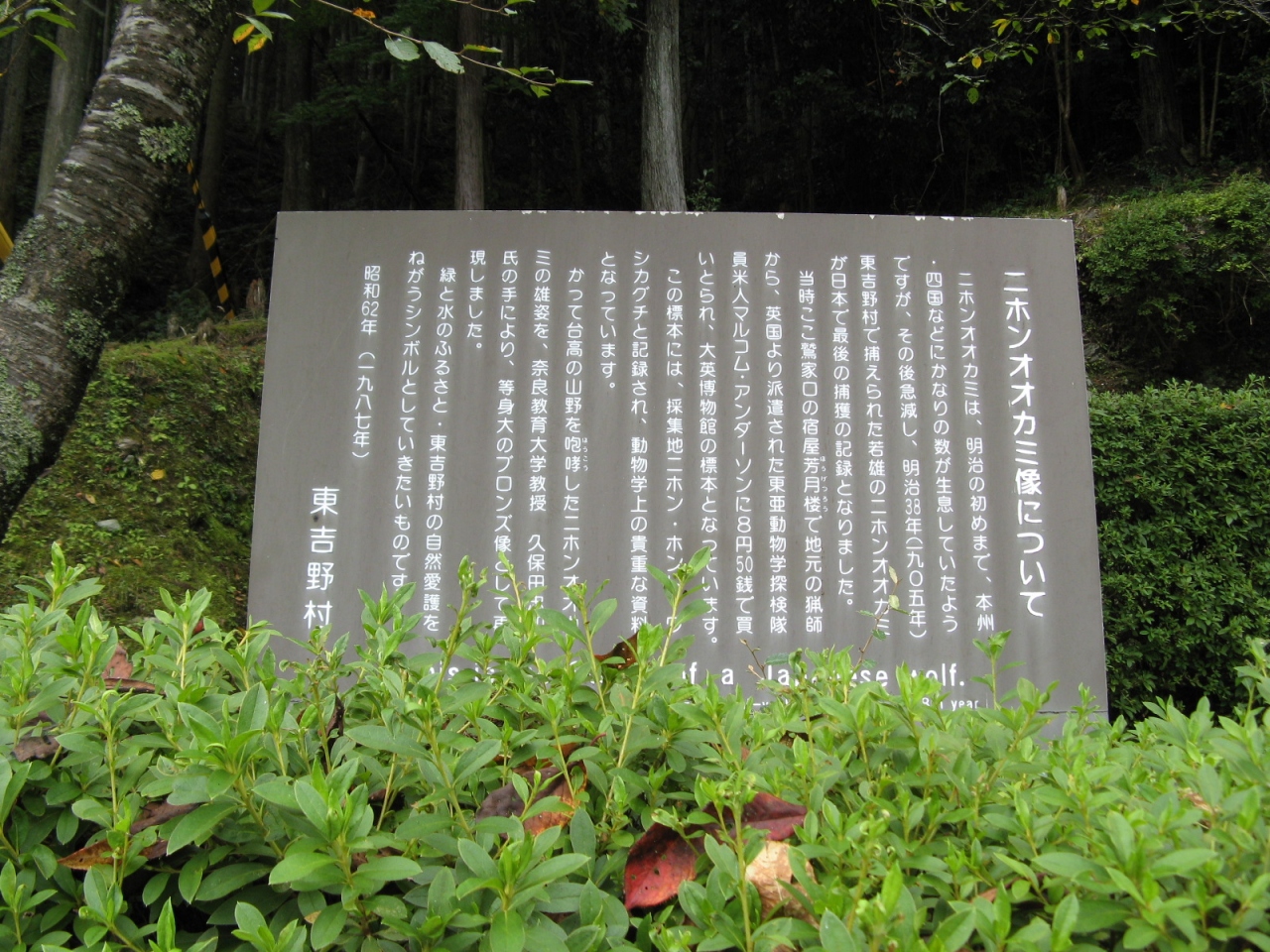 津風呂ダムに行く途中、東吉野村の県道16号線を走っていて偶然、「日本オオカミの像」を見つけました。現地にある説明碑(添付写真参照)によると、明治時代の初めまで日本各地にいた日本オオカミが明治38年(1905年)、東吉野村において捕らえられた日本最後のニホンオオカミをモデルとして造られた等身大のブロンズ像だそうです。