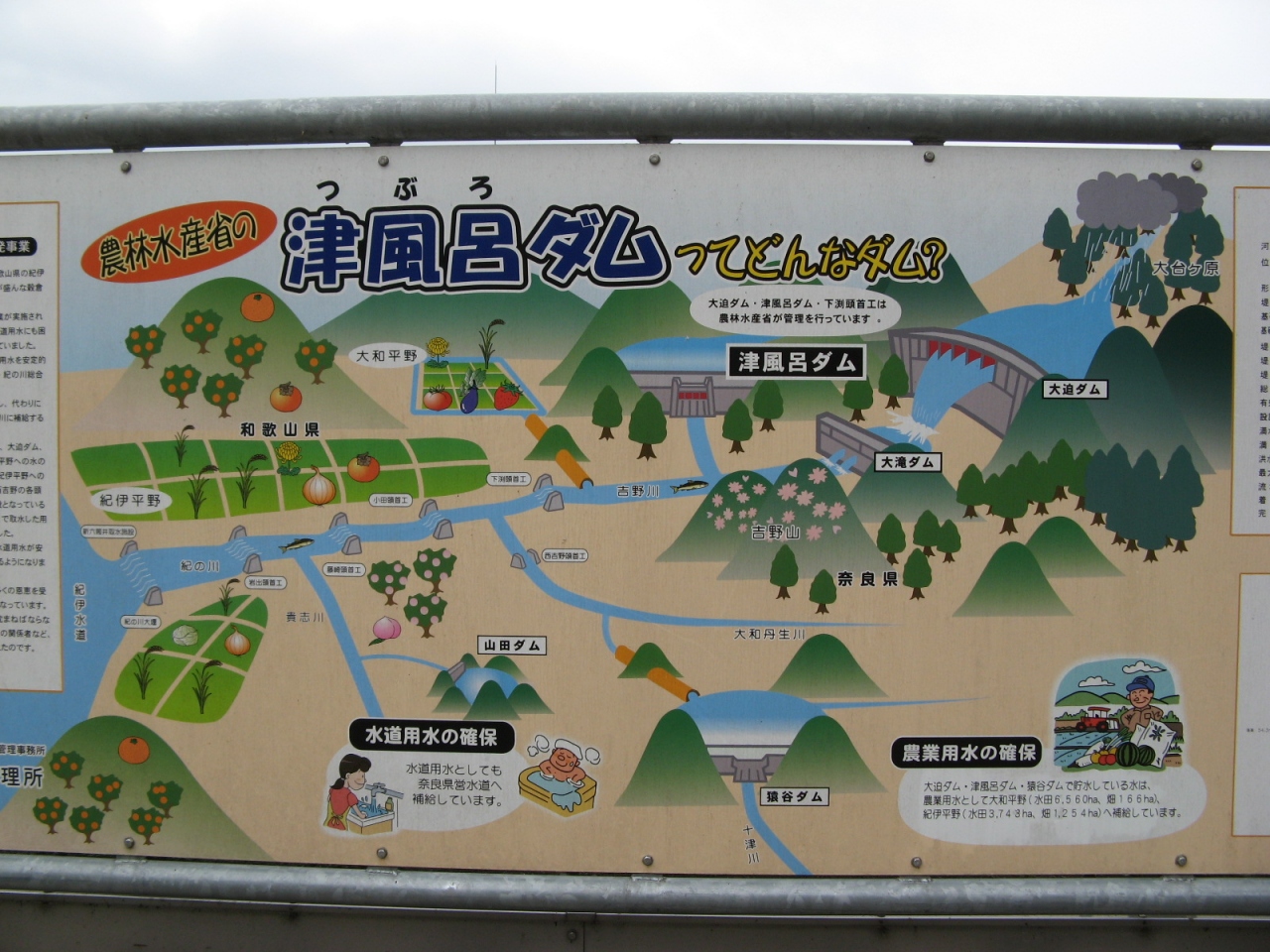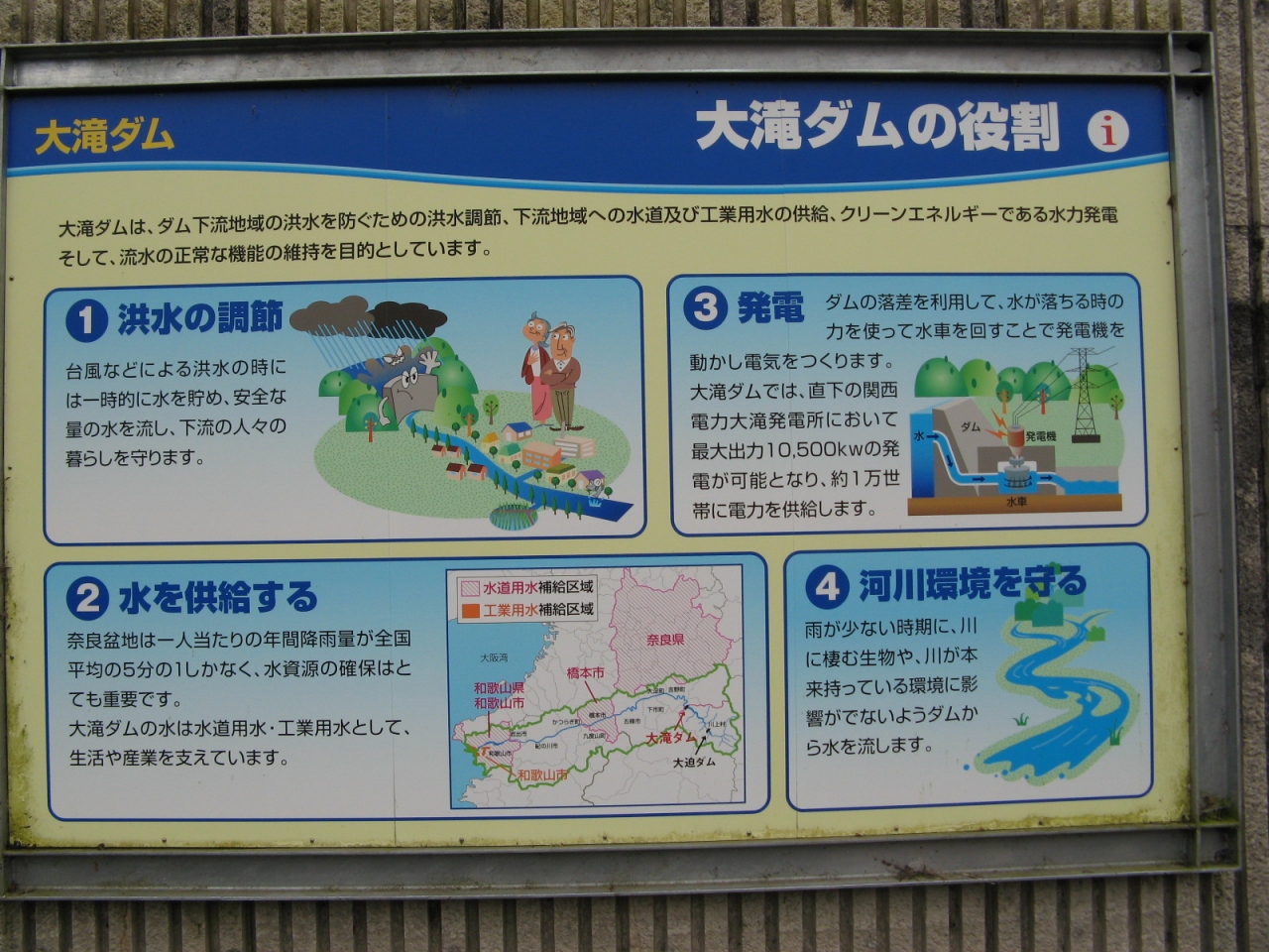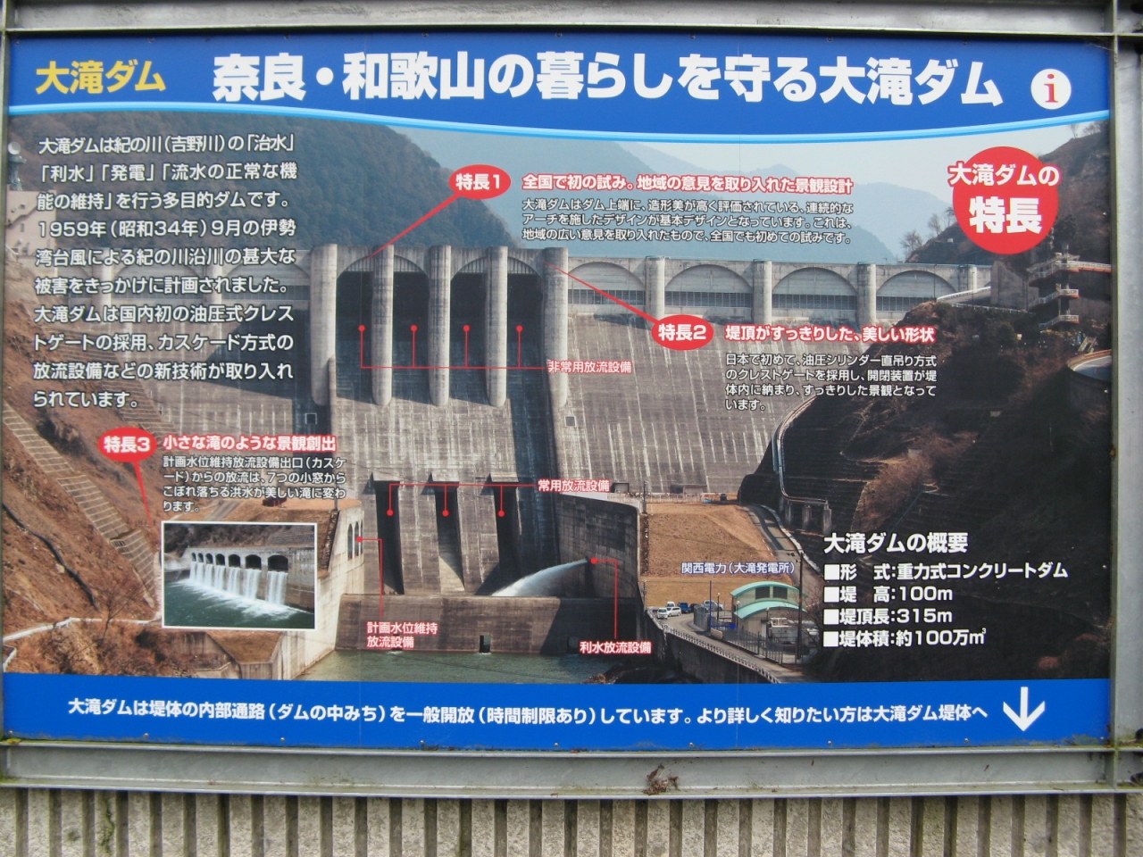吉野川の上流に設けられた“大滝ダム”を見学してきました。大滝ダムは、は洪水調節、上水道、工業用水、発電を目的とした堤高100m、堤頂長315mの重力式コンクリートダムです。