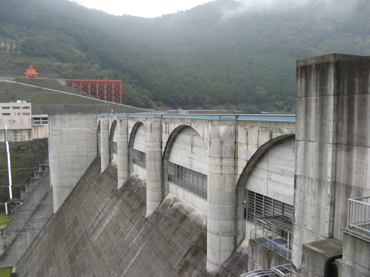 着工が1962年、竣工が2012年、計画から半世紀経てようやく完成した新しいダムです。堤体上部の非常用放流設備(クレストゲート)4門、堤体下部に設置された常用放流設備(コンジットゲート)3門を装備しています。ダムの上端は連続的にアーチを施し、水位維持放流設備出口(カスケード)は七つの小窓を設けたデザインを取り入れるなどとても美しいダムです。