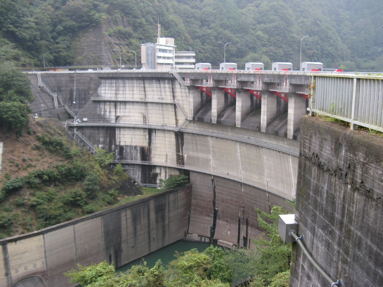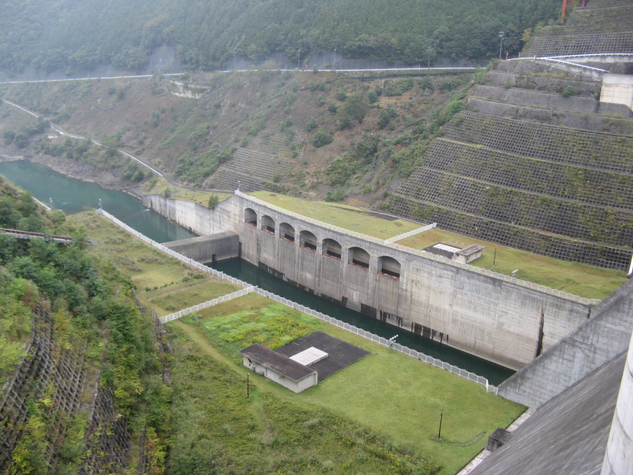 竣工が1973年と比較的古く、非常用洪水吐にラジアルゲート5門、河川維持ホロージェットバルブ1条を装備しており、堤体は年数を経た風格があります。