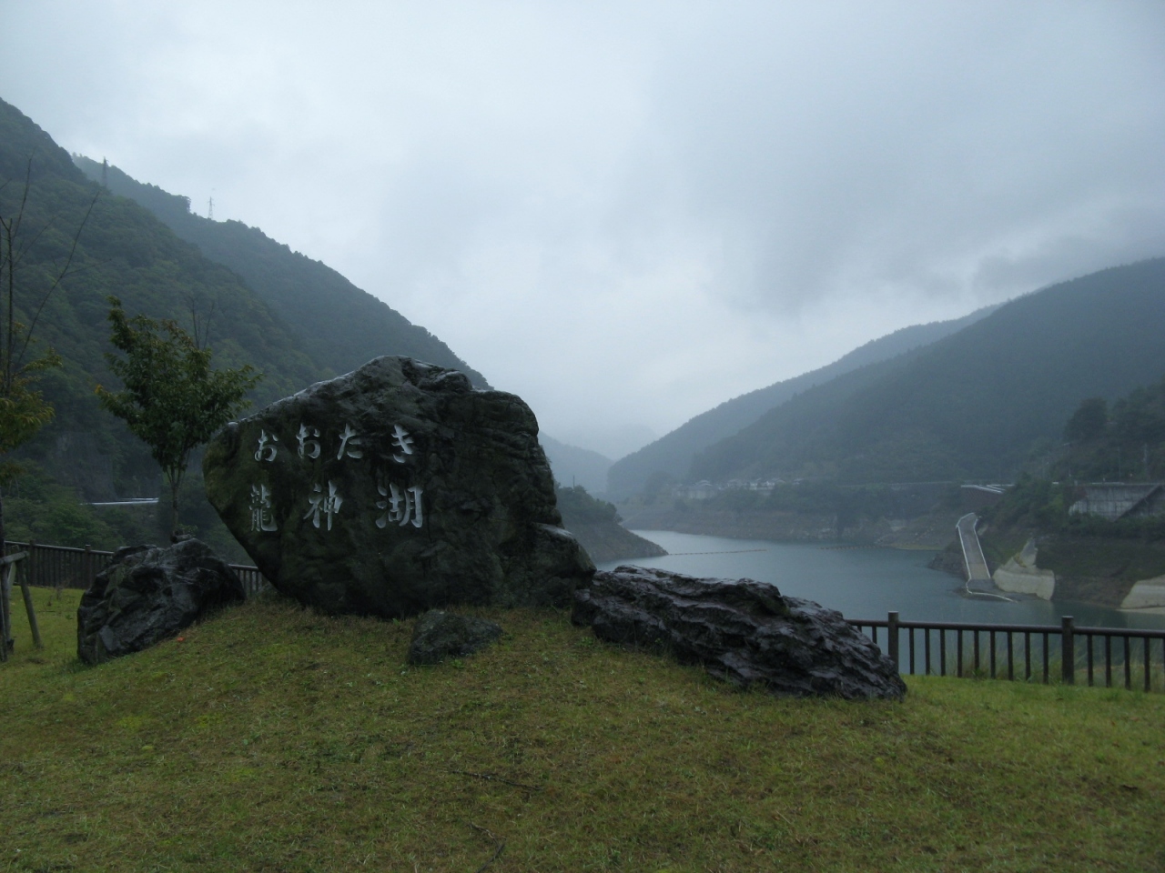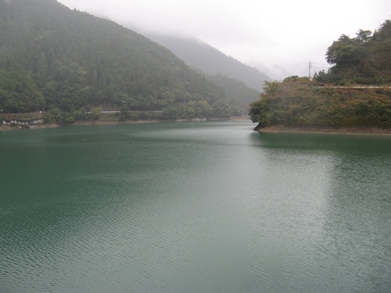 ダム堤体上は車も通行が可能で高さが88.5mあり、ダム堤体上から下流側を覗くとそこそこ迫力があり、ゲートから放流している姿を間近で見ることができました。なお、ダムによって造られた湖は大杉湖(おおすぎこ)と呼ばれていて、日本でも最も雨の多い大台ヶ原に発する大杉峡谷に造られたダムだけあってそのスケールの大きさを感じることができました。