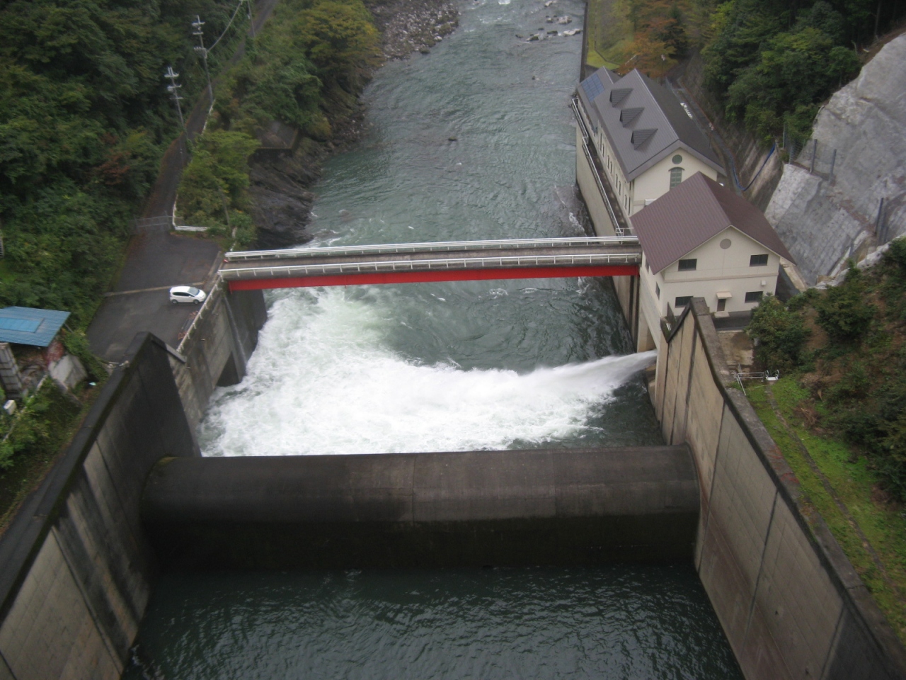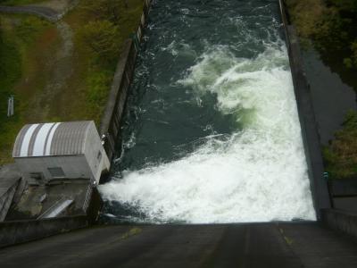 ダム堤体上は車も通行が可能で、高さが54.3mと比較的低いのでダム堤体上から下流側を覗いてもそれほど怖さはありませんでしたが、ゲートから放流している姿は豪快でした。