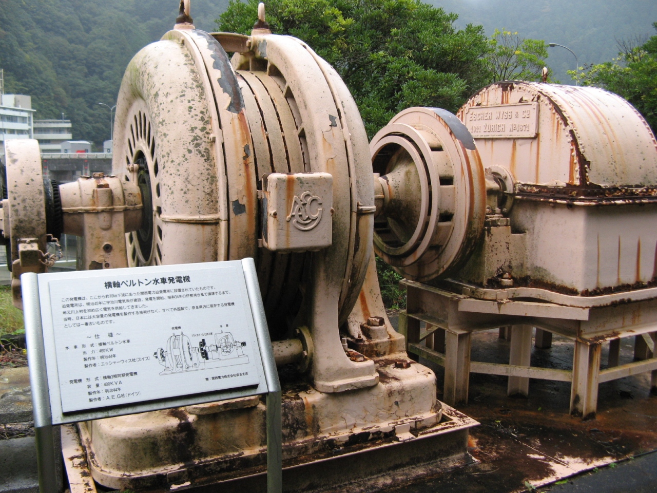 ダム堤体の傍に大迫ダムの役割や仕様と構造を記した説明板のほか、古いベルトン水車発電機が展示してあり判りやすくて良かったです。